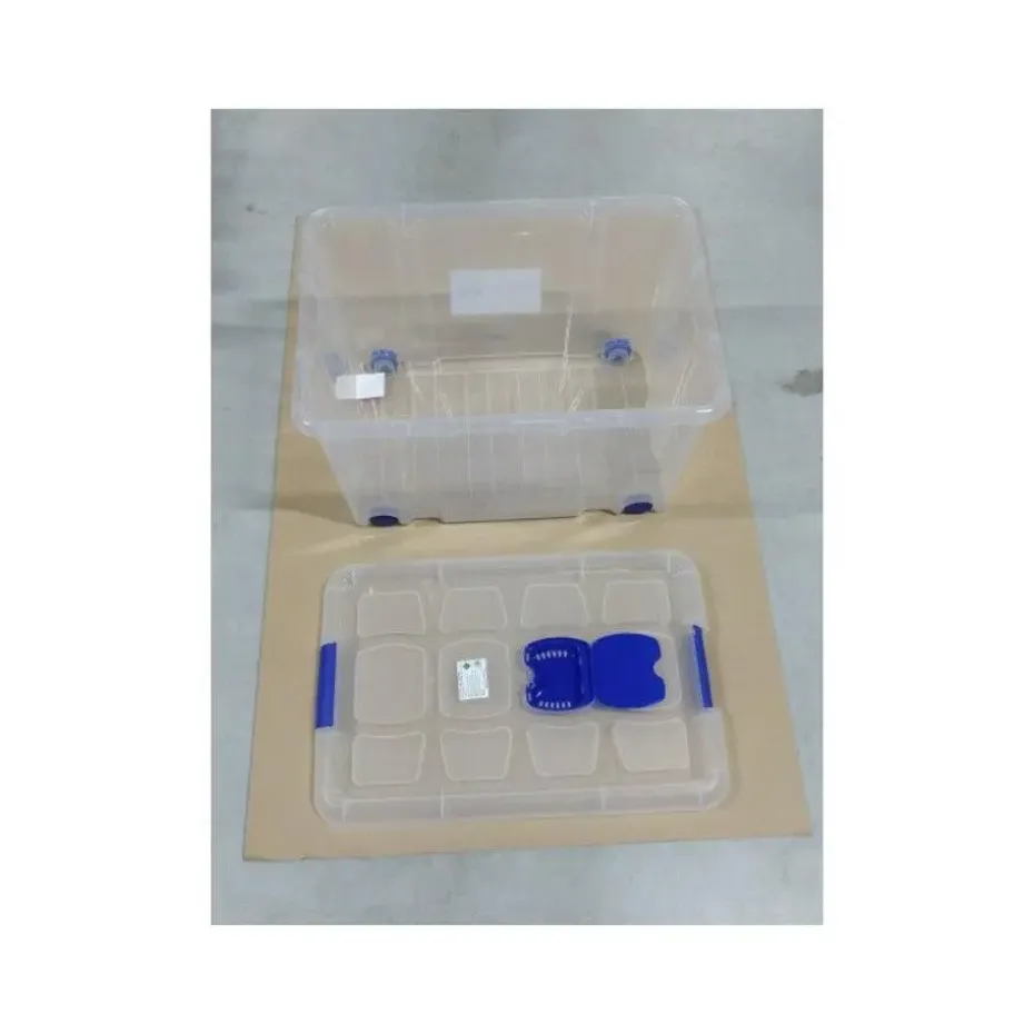 Opbergbox/opbergdoos met een inhoud van 55 liter, van kunststof, in de kleuren transparant/blauw. Een multifunctionele opberger voor het vocht- en stofvrij opbergen van een grote variatie spullen. Deze opbergdoos is bijvoorbeeld geschikt voor het opbergen van teken-/knutselspullen, extra kleding, spullen in de voorraadkast etc. Deze box is makkelijk te stapelen voor optimaal opberggemak. Ook is hij voorzien van handige en stevige sluitclips zodat het deksel goed op zijn plaats blijft en wieltjes.