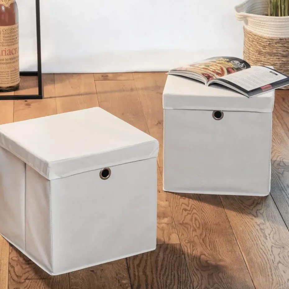 Opbergmand van Haushalt international. De kast opbergbox heeft een metalen ring aan de voorkant, voor makkelijk uit de kast pakken/schuiven. De zijwanden zijn verstevigd met dik karton voor extra stabiliteit en daardoor zijn de manden zeer geschikt voor bijvoorbeeld in een kinderkamer, of in een vakkenkast. Wanneer je de mand niet nodig heeft kun je deze makkelijk opvouwen en opbergen.