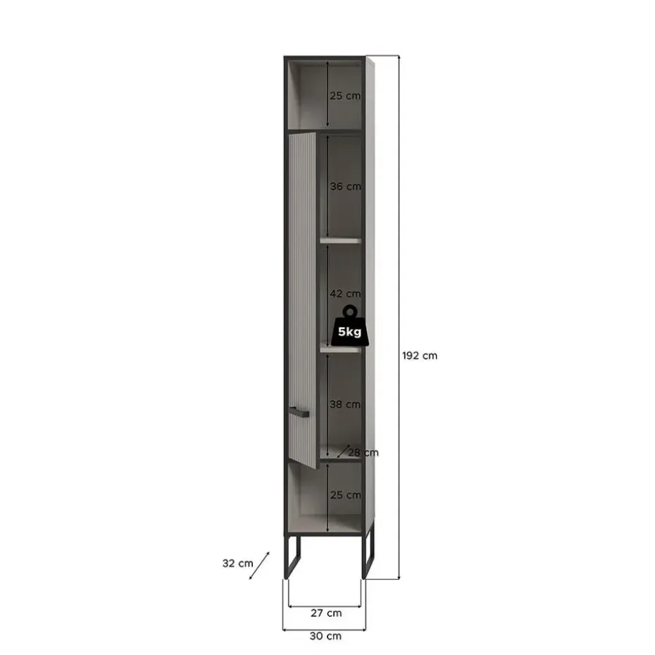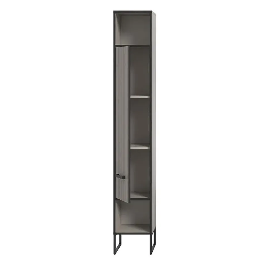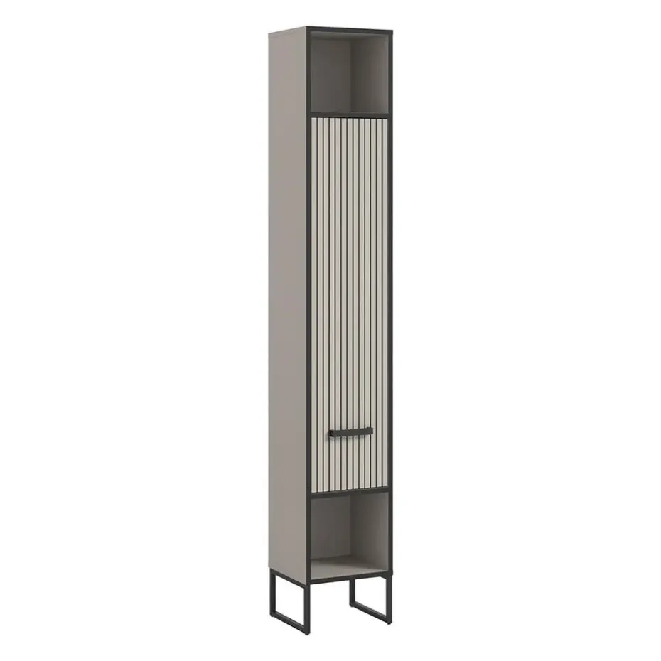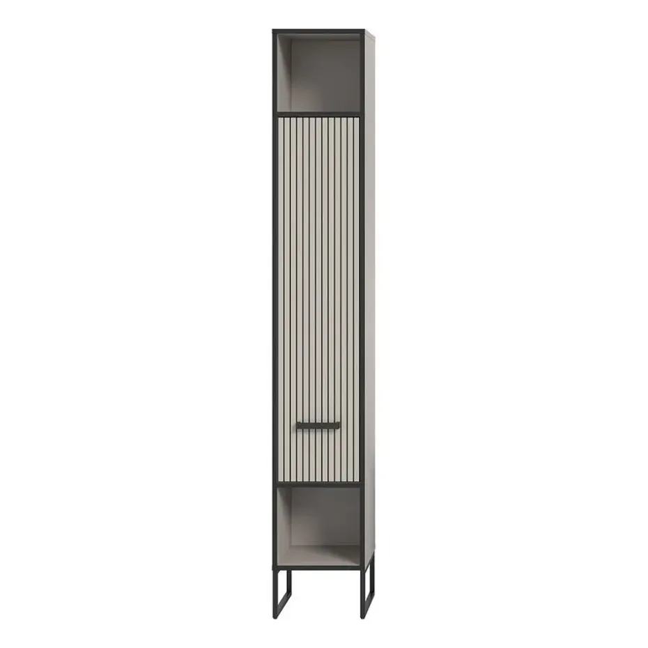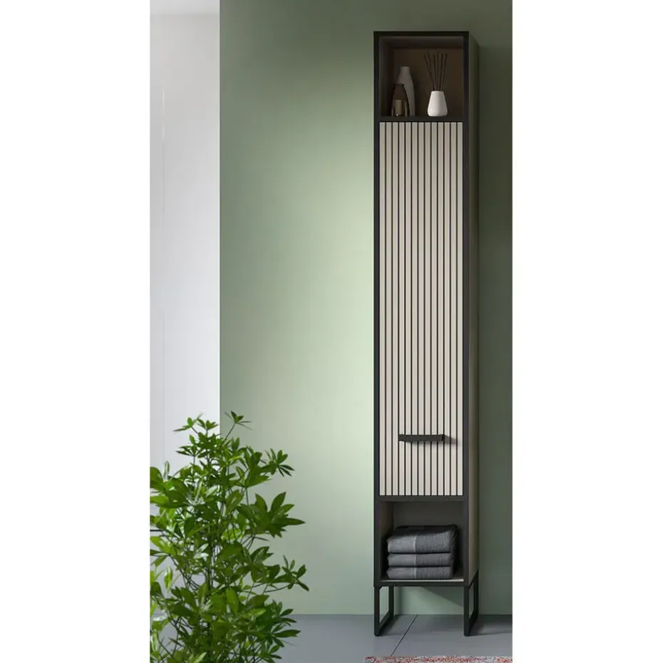 De Bagno hoge kast voor de badkamer combineert Scandinavische rust met een industriële touch. Met zijn twee open vakken en elegante lamellendeur biedt de kast zowel praktische opbergruimte als een decoratieve uitstraling. De lichtgrijze body en verticale lamellenstructuur in crèmekleurig contrast worden geaccentueerd door de zwarte metalen frames en poten, die het meubel van de vloer tillen en een licht en luchtig gevoel creëren.