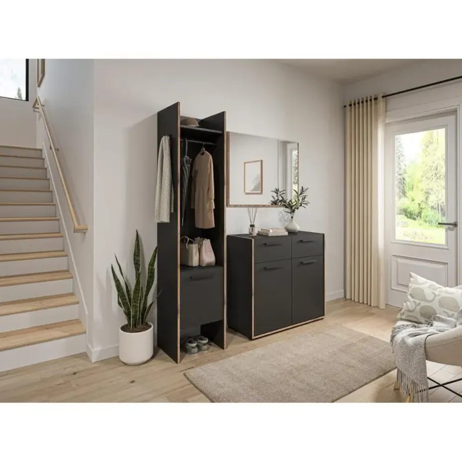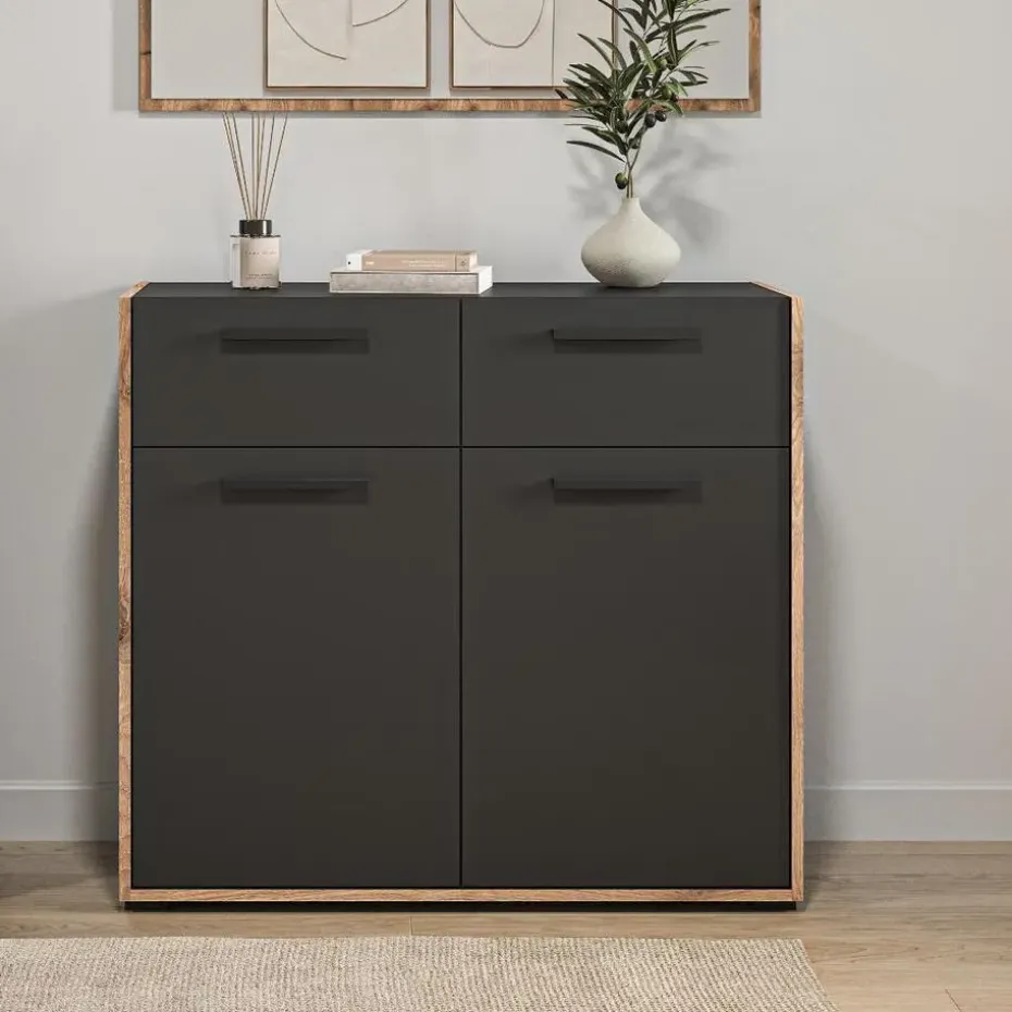 Bueno kommode 2 deuren, 2 lades donkergrijs. Aantal paar schoenen: 8. Lade met volledig uittrekbare lade. Deze ladekast biedt niet alleen voldoende opbergruimte, maar brengt ook meer orde en overzicht in uw huis – waardoor uw dagelijks leven merkbaar gemakkelijker en comfortabeler wordt. Stelt u zich eens voor hoe dit stijlvolle meubelstuk elegantie toevoegt aan uw woonruimtes en een uitnodigende sfeer creëert die uitnodigt om te blijven hangen en te ontspannen. De ladekast is gemaakt van hoogwaardig basaltmelamine en overtuigt met zijn moderne, tijdloze design en robuuste constructie. Twee lades met praktische, volledig uittrekbare geleiders bieden gemakkelijke toegang tot uw spullen, terwijl twee deuren extra opbergruimte verbergen. De onderhoudsvriendelijke oppervlakken zijn gemakkelijk te reinigen en zorgen ervoor dat de ladekast ook bij dagelijks gebruik netjes blijft. Met een breedte van 95 cm, een hoogte van 86 cm en een diepte van 37 cm past hij perfect in verschillende kamers – of het nu in de woonkamer, slaapkamer of hal is. Gebruik de lades voor kleding of kantoorbenodigdheden, de deuren voor boeken of decoratieve items, en creëer een opgeruimde omgeving die uw persoonlijke stijl weerspiegelt.
