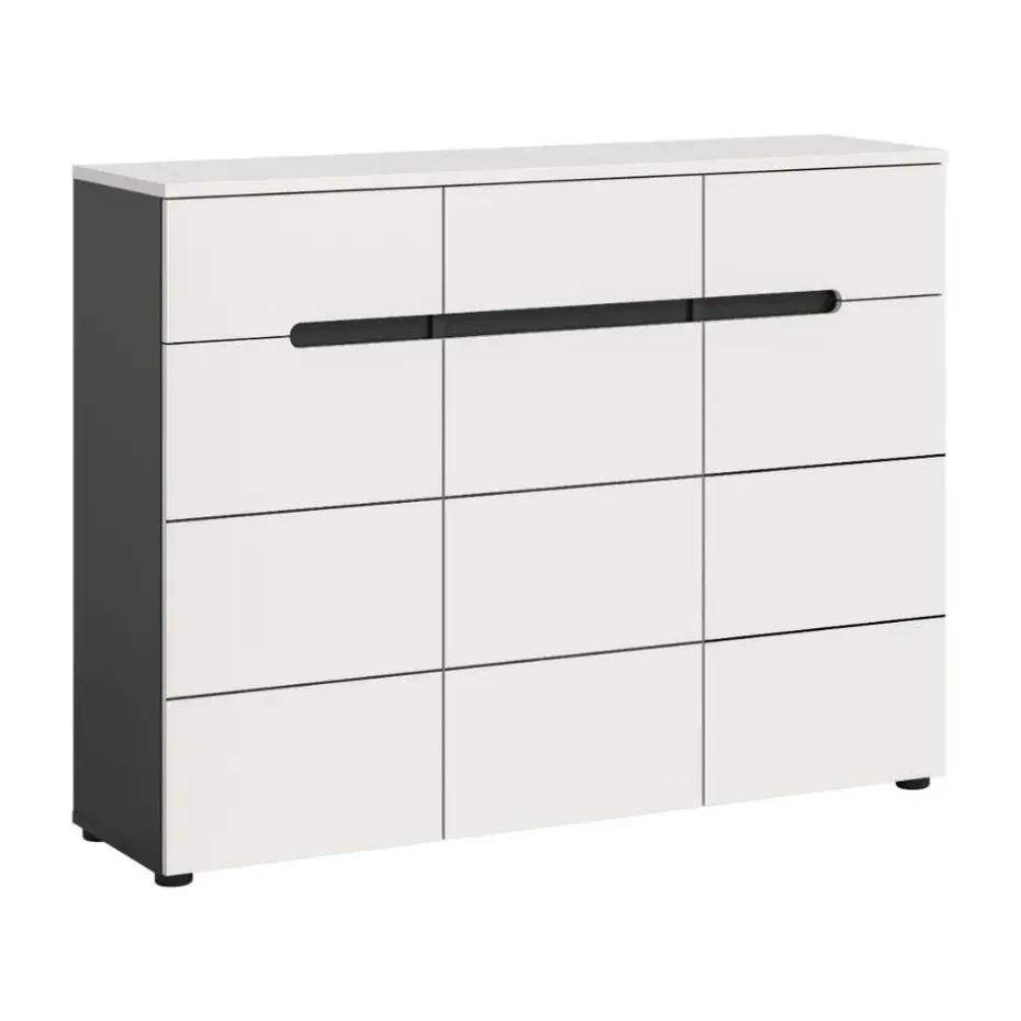 Canu schoenenkast 3 deuren, 3 lades wit, grijs. Aantal paar schoenen: 24. Deur Softclose. Lade volledige uittrekking. Deze schoenenkast (B/H/D: 120x94x37 cm) in witte afwerking is de perfecte aanvulling op elke hal! Deze ruime kast biedt ruimte aan maximaal 24 paar schoenen en creëert een nette en georganiseerde sfeer. Het moderne en tijdloze ontwerp past harmonieus in uw bestaande interieur en voegt een elegante touch toe aan uw hal. Twee praktische klapdeuren bieden snelle toegang tot uw schoenen, terwijl het slanke ontwerp hem ook in kleinere ruimtes een goede oplossing maakt. Of het nu in een eengezinswoning of een eenpersoonsappartement is, deze schoenenkast combineert stijl en functionaliteit. Optimaliseer uw hal met deze hoogwaardige schoenenkast en geniet van de voordelen van organisatie!