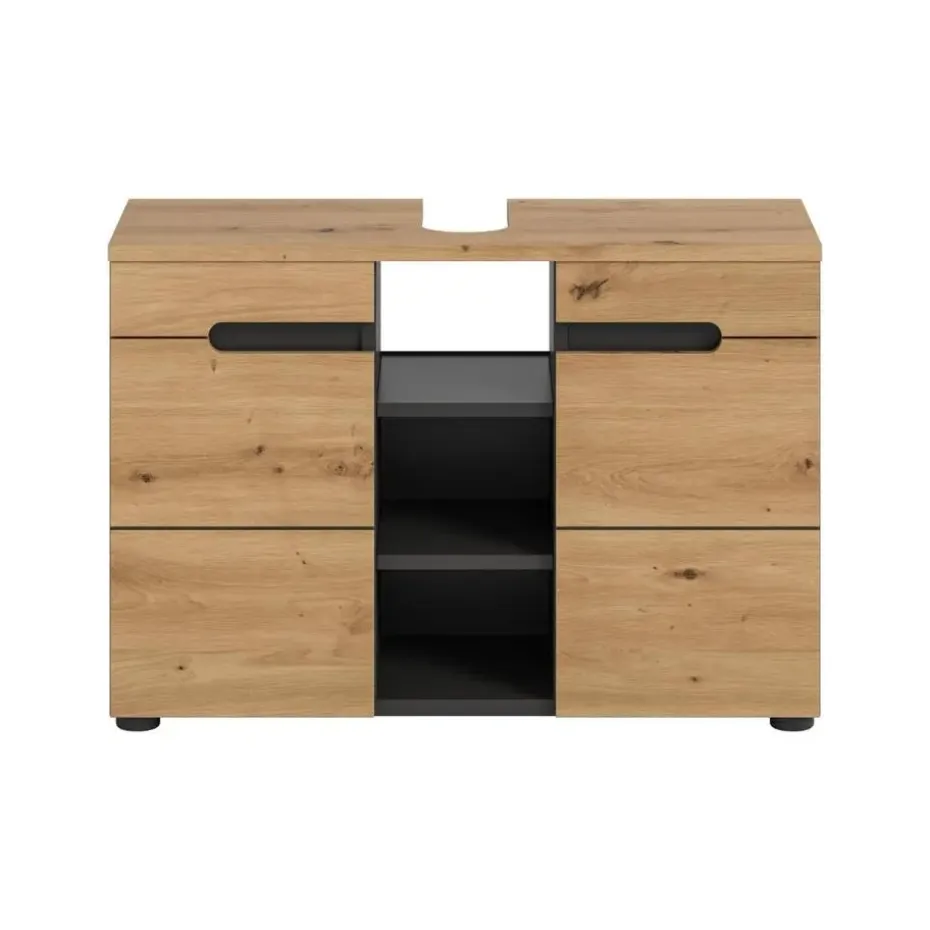 Canu wastafel 2 deuren, 3 planken eiken decor, grijs. Zonder wastafel. Deur met Softclose. Deze wastafelmeubel (B/H/D: 80x55x34 cm) overtuigt door de elegante combinatie van basaltgrijs en handgemaakte houtdecors. Met zijn moderne en tijdloze design past dit meubelstuk harmonieus in elke badkamer. De zwarte binnenkant vormt een geraffineerd contrast met de realistische houtstructuur. Deze wastafelmeubel biedt extra ruimte met verticale scheidingswanden aan beide zijden, waardoor u uw badkamerartikelen optimaal kunt organiseren. De twee deuren met geïntegreerde, verzonken handgrepen zorgen voor een minimalistische, naadloze look en maken de kast tot een visueel hoogtepunt. Het meubel is gemaakt van FSC®-gecertificeerd houtmateriaal, wat een milieuvriendelijke en duurzame productie garandeert. Met zijn compacte afmetingen is deze wastafelmeubel de ideale oplossing voor moderne badkamers die functionaliteit en esthetiek combineren. Richt uw badkamer stijlvol en milieubewust in met deze hoogwaardige wastafelmeubel!