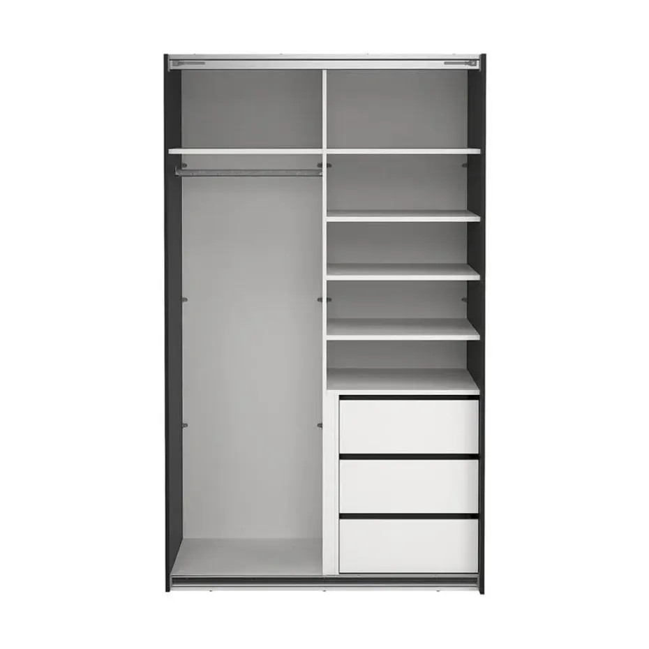 De Catania schuifdeurkast in matzwart is een compacte en stijlvolle oplossing voor moderne woningen waar de ruimte optimaal benut moet worden. Met zijn afmetingen van 120×200 cm past de kast perfect in kleinere slaapkamers, gangen of tienerkamers, zonder in te leveren op functionaliteit. De twee schuifdeuren schuiven soepel en nemen geen extra ruimte in beslag vóór de kast – ideaal voor smalle ruimtes. De matzwarte afwerking zorgt voor een exclusieve en tijdloze uitstraling die perfect te combineren is met zowel lichte als donkere interieurkleuren. Binnenin is de kast voorzien van zowel een kledingroede als planken, wat zorgt voor veel opbergruimte.