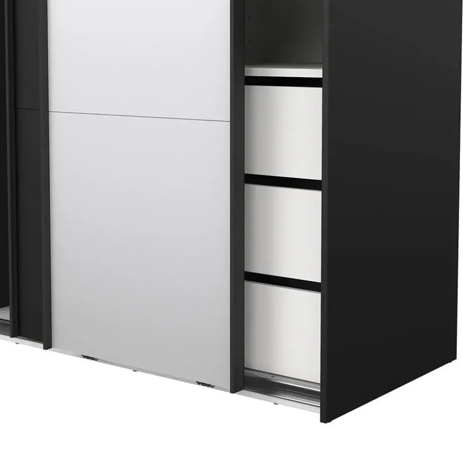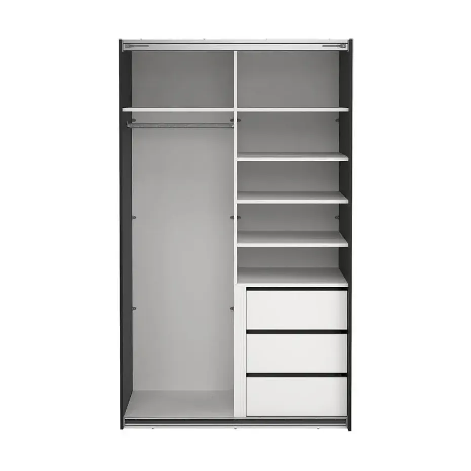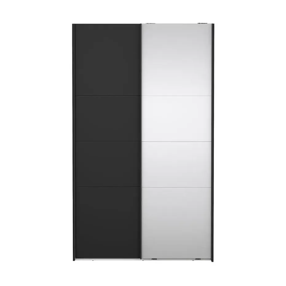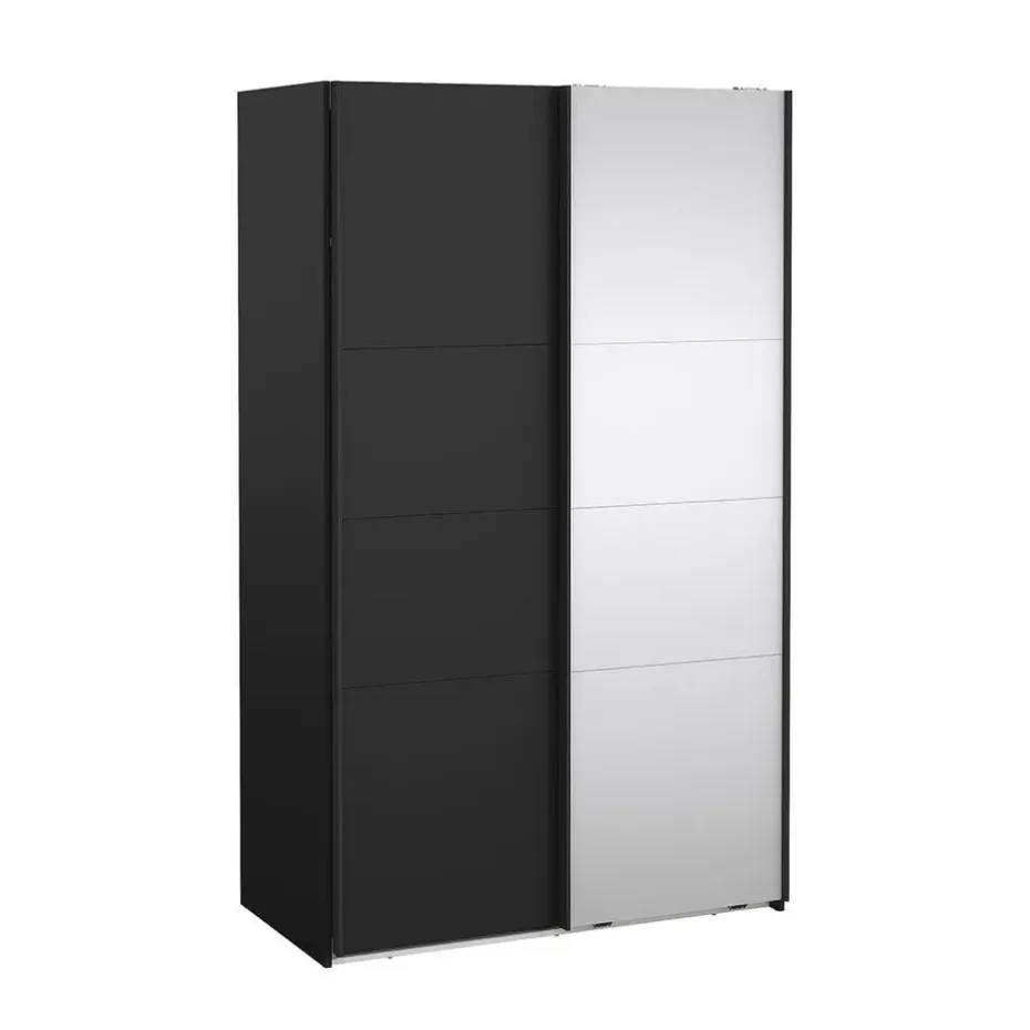 De Catania schuifdeurkast in matzwart met spiegeldeur combineert modern design en praktische functionaliteit in één compact meubelstuk. Met een breedte van 120 cm en een hoogte van 200 cm is hij perfect voor kleinere kamers waar maximale opbergruimte gewenst is zonder onnodig veel ruimte in te nemen. Eén deur heeft een elegant, matzwart oppervlak, terwijl de andere is voorzien van een spiegel, wat zowel praktisch is als een gevoel van meer licht en ruimte creëert. De schuifdeuren schuiven gemakkelijk en vereisen geen extra ruimte. Het interieur biedt goede opbergmogelijkheden met planken en een kledingroede voor zowel kleding als accessoires.