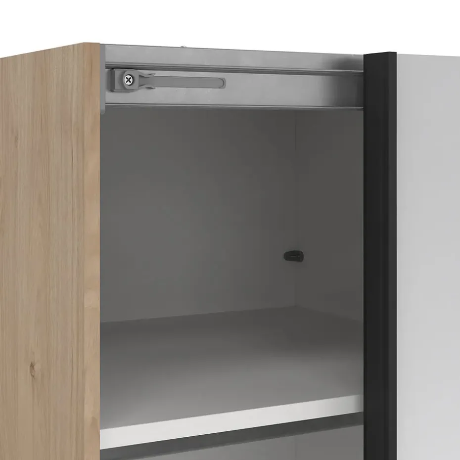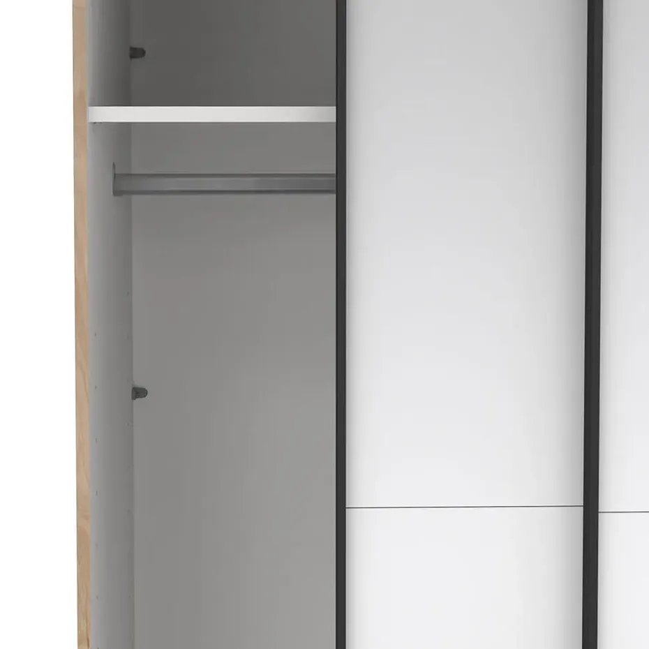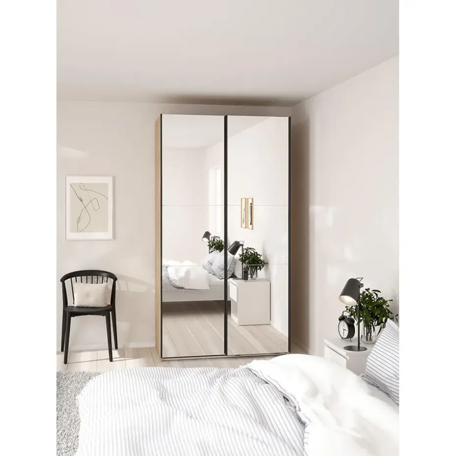 De Como schuifdeurkast met spiegeldeuren en eikenhouten decor combineert warme houttinten met praktisch design in een elegant meubelstuk dat de inrichting van de slaapkamer of hal naar een hoger niveau tilt. Met een hoogte van 220 cm biedt de kast veel verticale opbergruimte zonder onnodig vloeroppervlak in beslag te nemen. De twee schuifdeuren zijn voorzien van grote spiegelfronten, die het licht reflecteren en de kamer groter en opener laten lijken. De lichte houtstructuur zorgt voor een natuurlijke en gezellige sfeer die perfect past in zowel moderne als klassieke woningen. Een stijlvolle en functionele oplossing voor wie een lichte, ruimtelijke en harmonieuze uitstraling in huis wenst.
