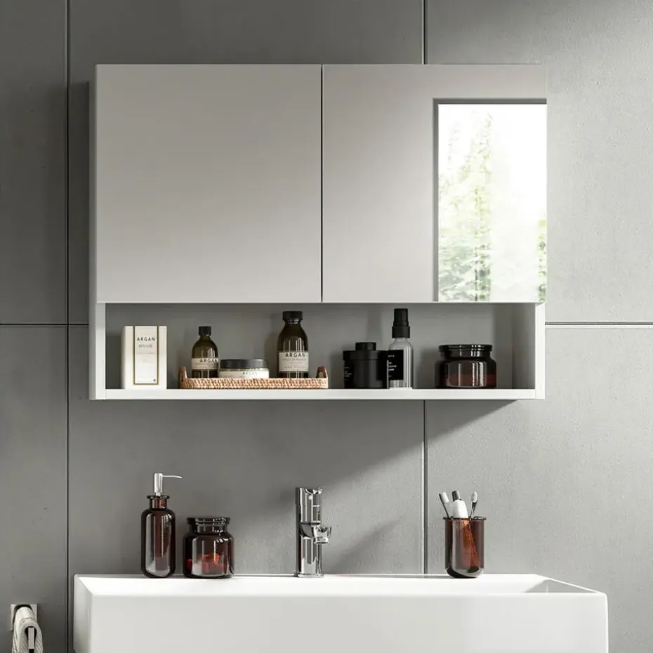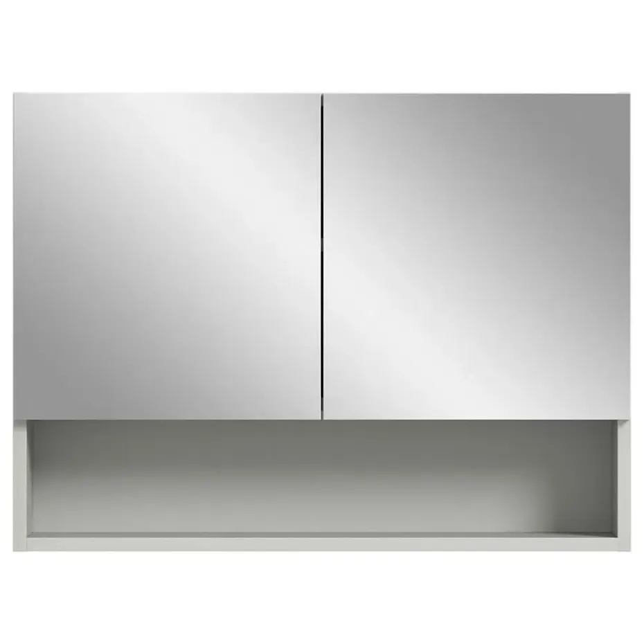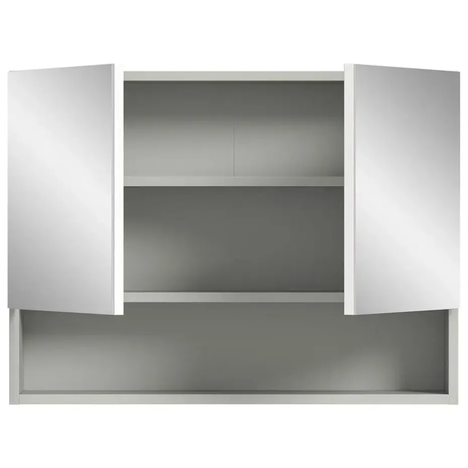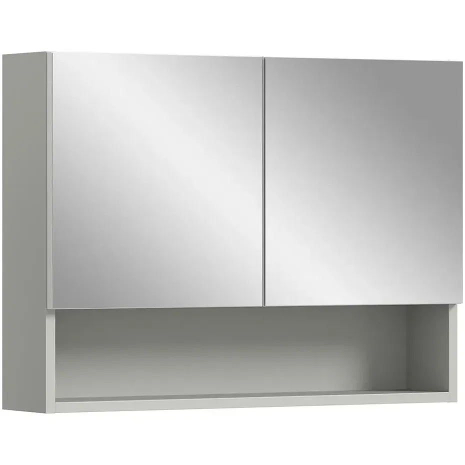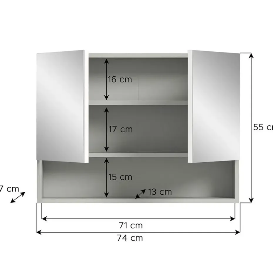 Copa spiegelkast badkamer 2 deuren 1 vak 1 plank lichtgrijs, spiegel. Deur Softclose. Losse planken: 1. Deze moderne kast met spiegeldeuren combineert stijl en functionaliteit op een praktische manier. Hij heeft een ruime plank aan de onderkant die extra opbergruimte biedt voor toiletartikelen of andere kleine spullen. De twee spiegeldeuren van de kast bieden zowel functionaliteit als een stijlvolle uitstraling die goed past in zowel badkamers als andere kamers.