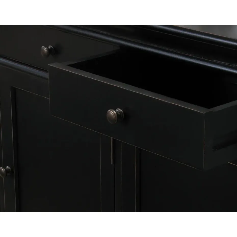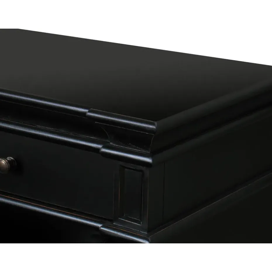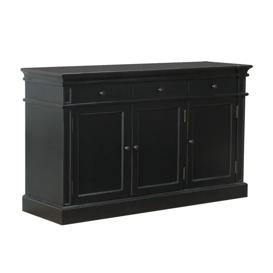 Amaretta dressoir met 3 deuren en 3 laden, zwart antiek patina. Breedte 142 cm, hoogte 86 cm is een dressoir in de kleur zwart, dat zowel stijl als functionaliteit in uw huis brengt. Antiek zwart dressoir uit onze populaire Amaretta serie. Het dressoir is gemaakt van massief hout, antiek gepatineerd en voorzien van metalen handgrepen. Solide kwaliteitsmeubels met ziel. Stijlvol ontwerp met antieke patinatie. Een kwaliteitsmeubel, stijlvol, charmant en solide. Dit product is gemaakt met oog voor detail, wat zowel esthetische aantrekkingskracht als hoge duurzaamheid garandeert. Het is ontworpen met zowel functionaliteit als stijl in gedachten, waardoor het de perfecte keuze is voor elke kamer in uw huis. De gebruikte materialen zijn van hoge kwaliteit, waardoor het product een lange levensduur heeft en bestand is tegen dagelijks gebruik. Of het nu voor opslag is of als decoratieve toevoeging, dit product zal uw interieur naar een hoger niveau tillen en extra comfort en elegantie in uw huis brengen.