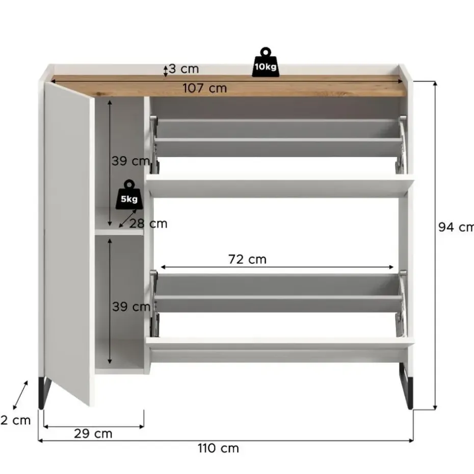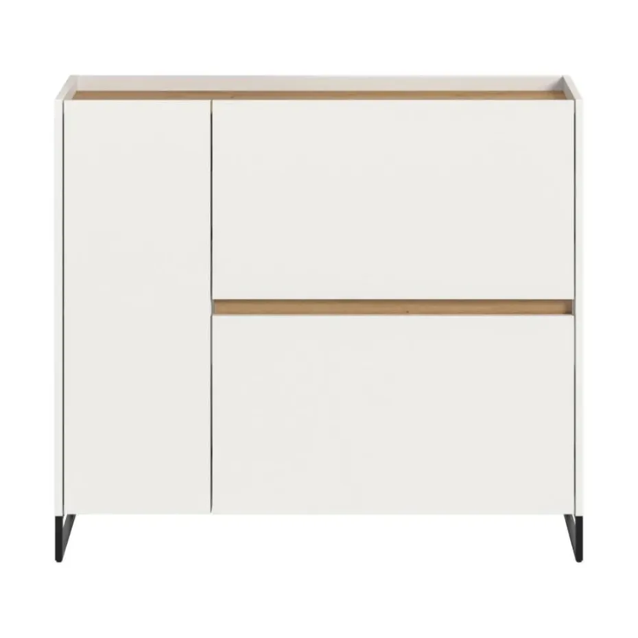 Drive schoenenkast 1 deur, 2 vouwdeuren wit. Aantal paar schoenen: 9. Deur Softclose. Deze schoenenkast (97x110x32 cm) in wit met een Artisan Oak-afwerking heeft één deur, één in hoogte verstelbare plank, twee vakken en twee schoenenplanken voor circa 12 paar schoenen. FSC®-gecertificeerd houtmateriaal garandeert duurzaamheid. Het onderhoudsvriendelijke oppervlak en de snelle montage zorgen voor gemak. Perfect uit te breiden met andere artikelen uit dezelfde serie. Voor een georganiseerd en stijlvol huis.