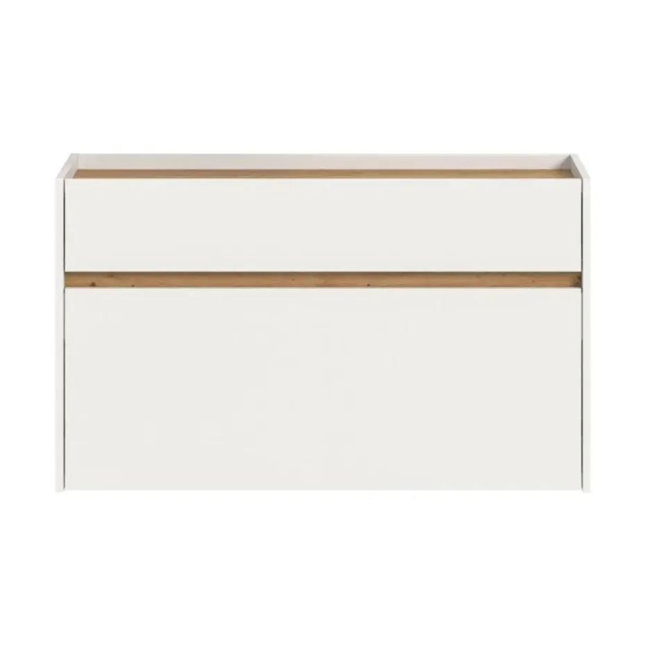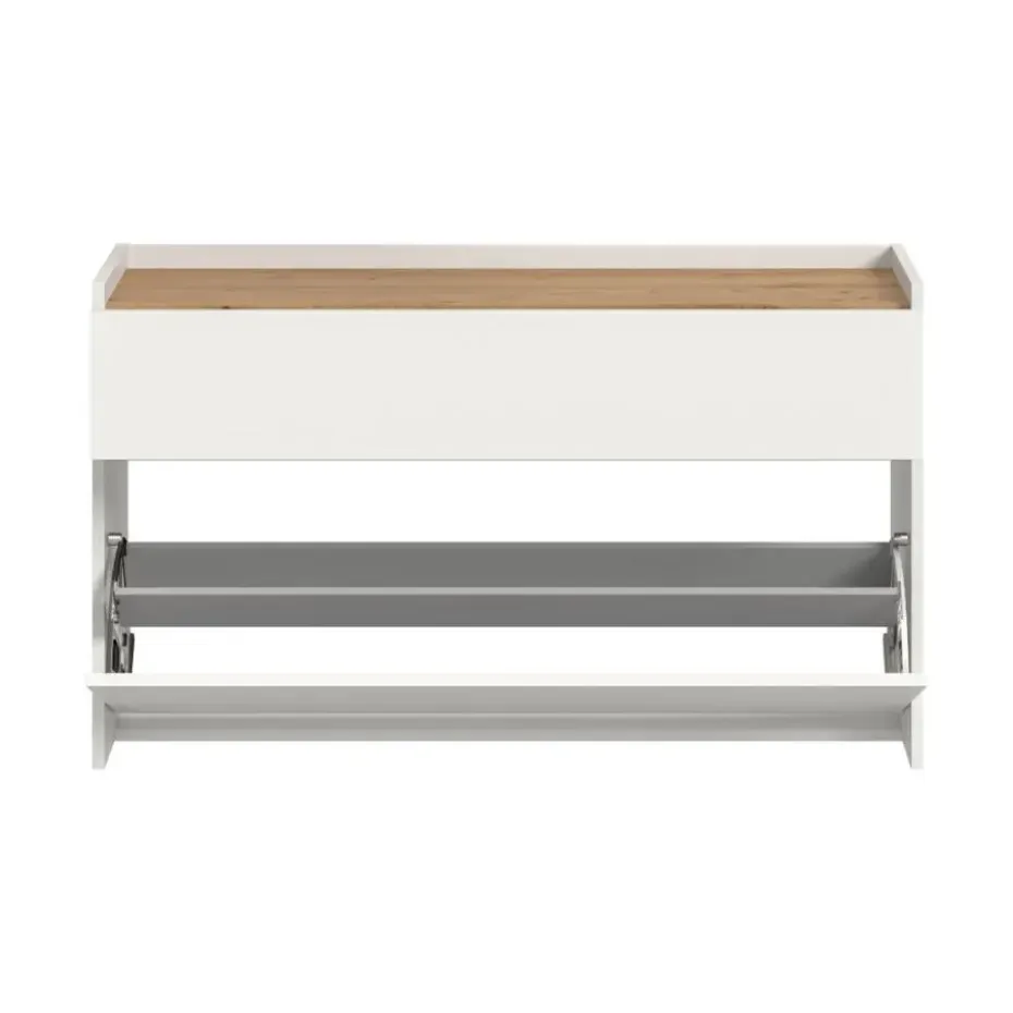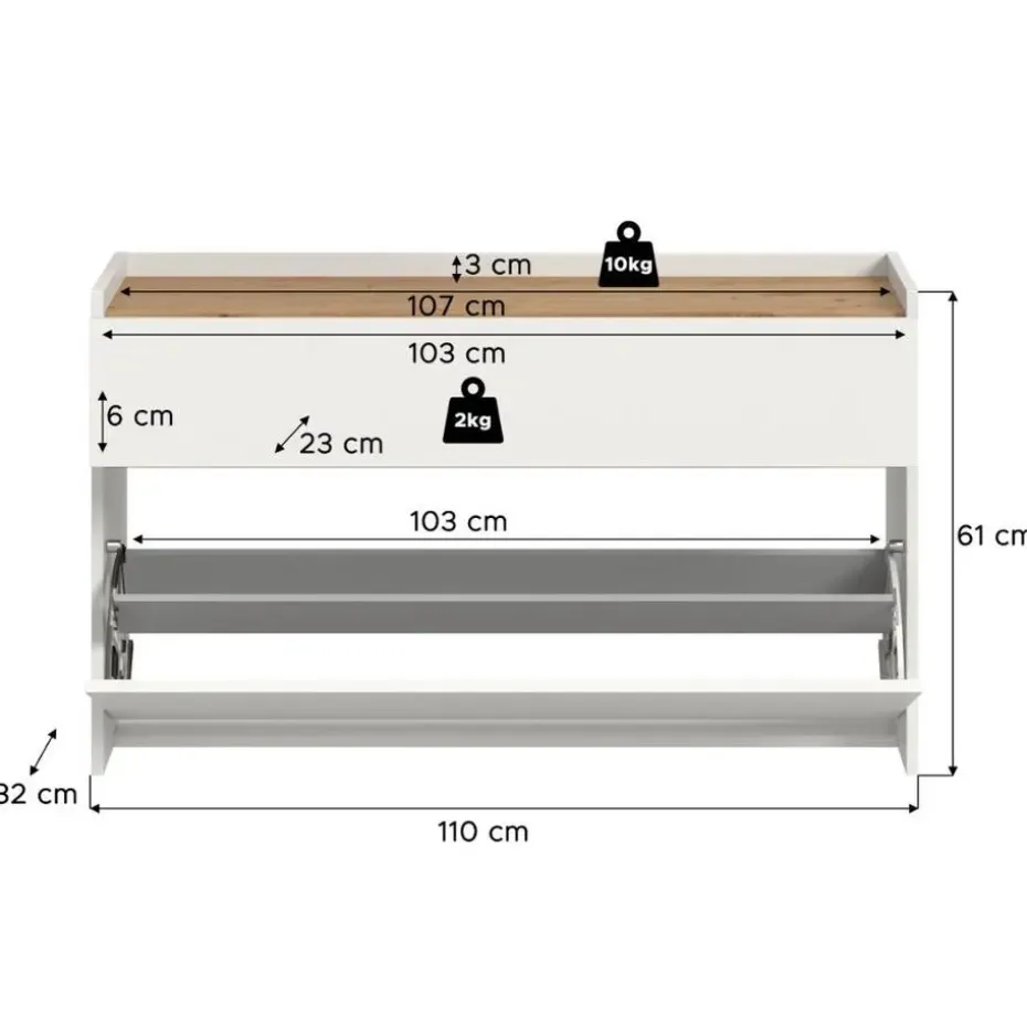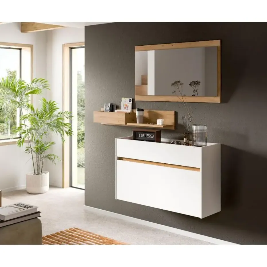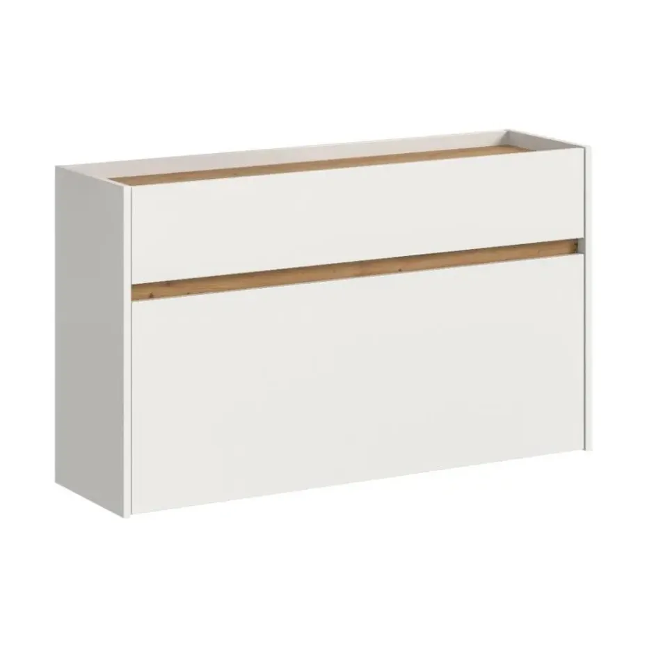 Drive schoenenkast 1 vouwdeur, 1 lade wit. Aantal paar schoenen: 8. Deze schoenenkast (61 x 110 x 32 cm) in wit met een Artisan Oak-afwerking heeft één lade en één schoenenplank, goed voor ongeveer acht paar schoenen. Hij is gemaakt van FSC®-gecertificeerd houtmateriaal en is duurzaam. Het onderhoudsvriendelijke oppervlak en de snelle montage maken hem bijzonder gebruiksvriendelijk. Breid je opbergmogelijkheden uit met andere artikelen uit dezelfde collectie voor extra organisatie en stijl.