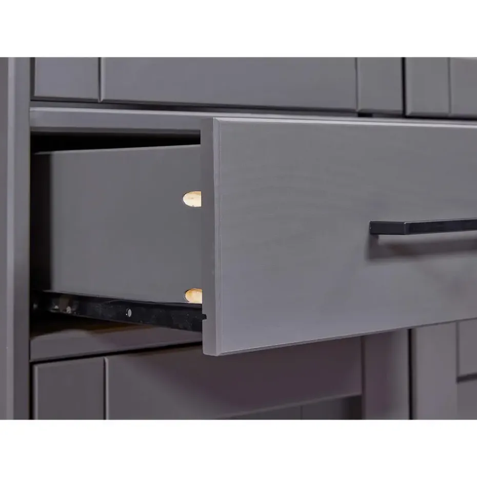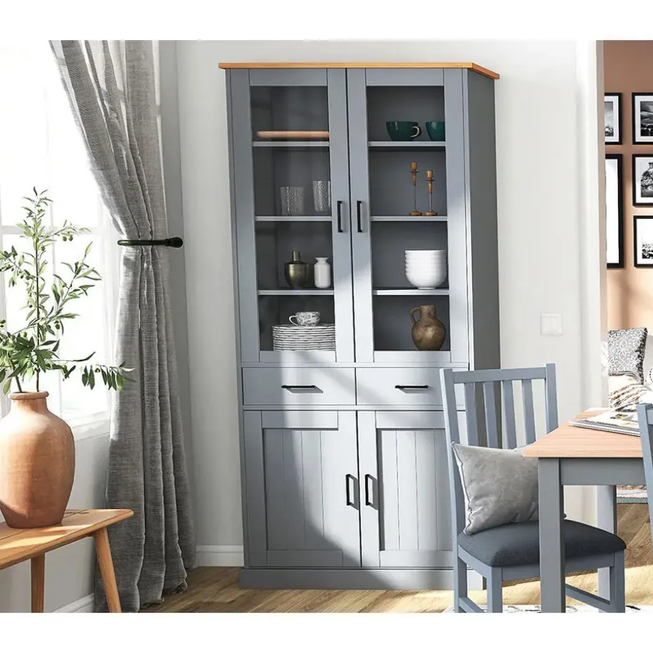 Forenzo vitrinekast 4 deuren, 2 lades grijs, naturel. De Forenzo vitrinekast is een elegante en functionele opbergoplossing die tijdloos design combineert met functionaliteit. Met zijn vier deuren en twee ruime lades biedt hij voldoende ruimte voor het opbergen en tentoonstellen van je favoriete spullen. Het bovenste gedeelte met glazen deuren maakt het gemakkelijk om serviesgoed, boeken of decoratieve voorwerpen tentoon te stellen, terwijl het onderste gedeelte met massieve deuren zorgt voor discrete opslag. Het mooie contrast van de kast tussen het warme blad en de grijze afwerking maakt hem tot een stijlvolle keuze voor zowel klassieke als moderne woningen. De Forenzo vitrinekast is het ideale meubelstuk om met elegantie orde te scheppen.