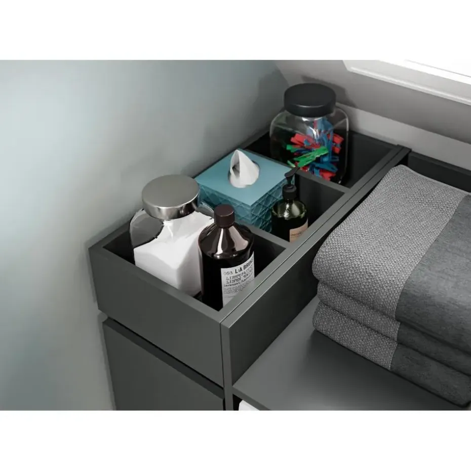 Free badkamerkast 1 lade, 3 planken antraciet. Deze boekenkast (B/H/D: 29x101x60 cm) in een stijlvolle antracietkleurige afwerking is de perfecte oplossing voor iedereen die van slimme opbergruimte houdt. Met een praktische uittreklade, drie vakken en een lade biedt deze boekenkast veelzijdige opbergruimte voor je spullen. Open planken bieden bovendien snelle toegang tot je favoriete spullen.