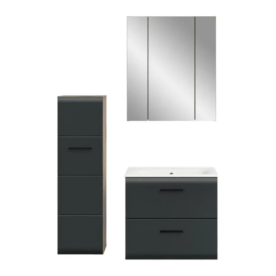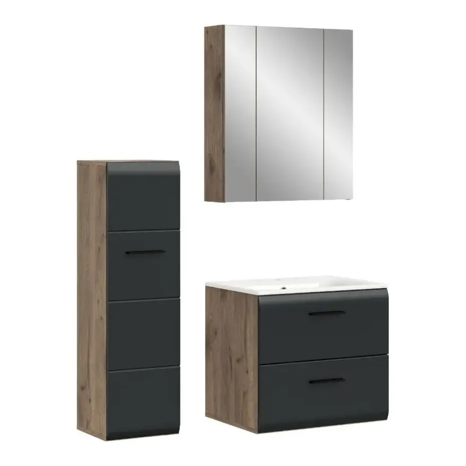Ice badkamer zwart mat, eiken decor. Incl. wasbak. Zonder armatuur. Lade volledig uittrekbaar. Badkamercombinatie (B/H/D: 105x185x46 cm) 4-delig met opbergmeubel, matzwart & Nox Oak. Deze combinatie is de slimme keuze voor designliefhebbers die van slimme oplossingen houden. Met het speciale opbergmeubel, wastafelmeubel inclusief wastafel en spiegelkast krijgt u een ruimtebesparende, functionele oplossing met een moderne uitstraling.