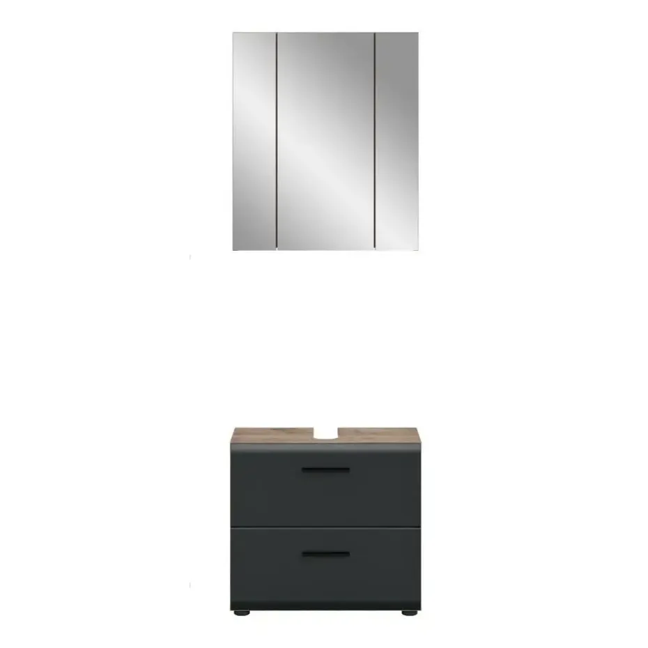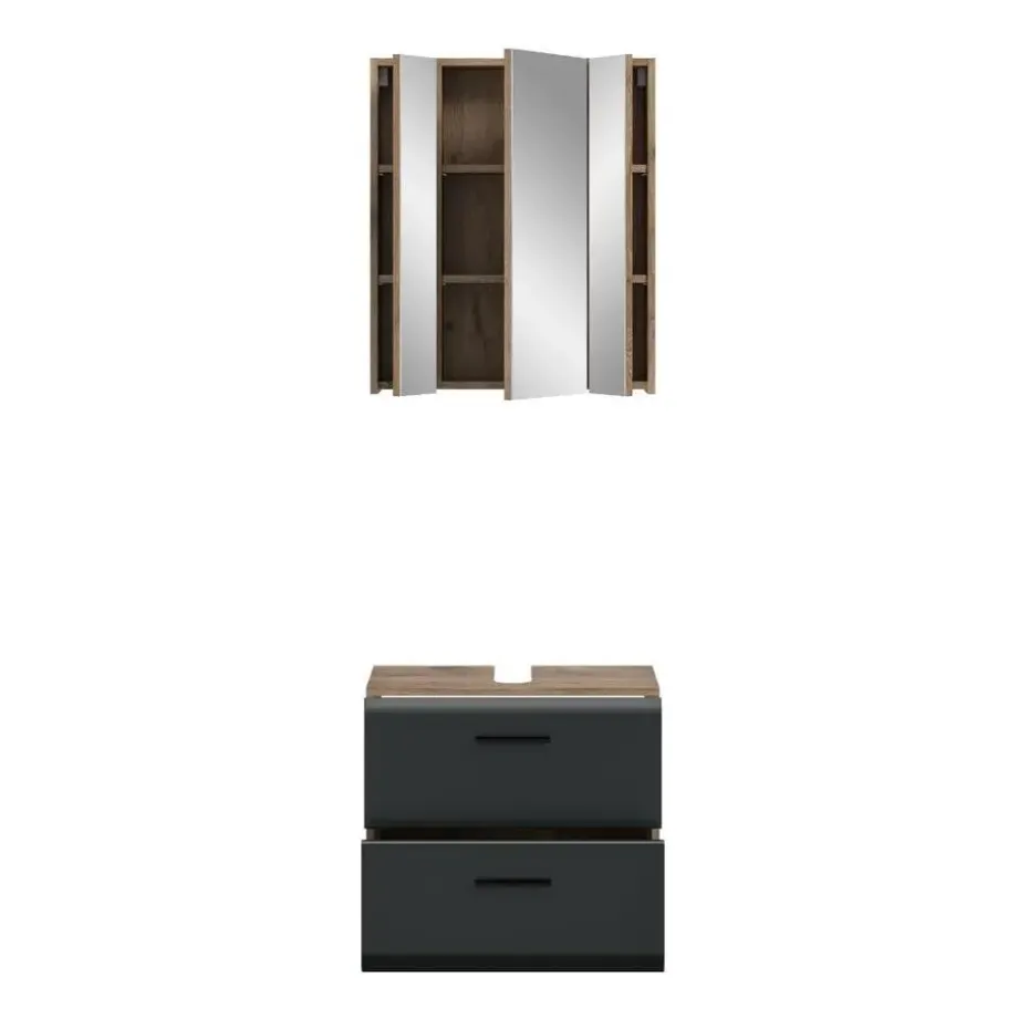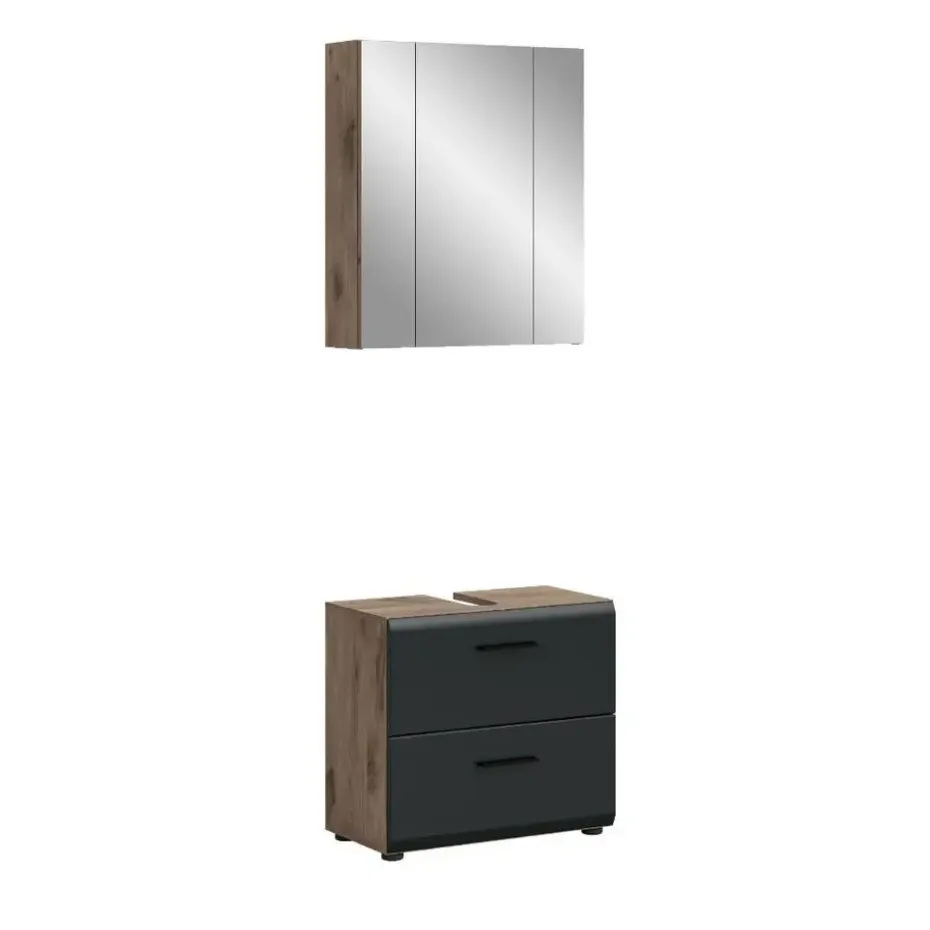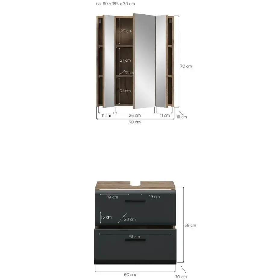 Ice badkamer zwart mat, eiken decor. Zonder wasbak. Lade volledig uittrekbaar. Badkamercombinatie (60x185x30 cm) 2-delig. Minimalistisch en ruimtebesparend ideaal voor gastenbadkamers of kleinere badkamers. De 2-delige set bestaat uit een wastafelmeubel en een spiegelkast, beide in een elegante combinatie van matzwart en Nox Oak. Compacte afmetingen, strakke lijnen en een modern design zorgen voor een harmonieuze badkameroplossing.