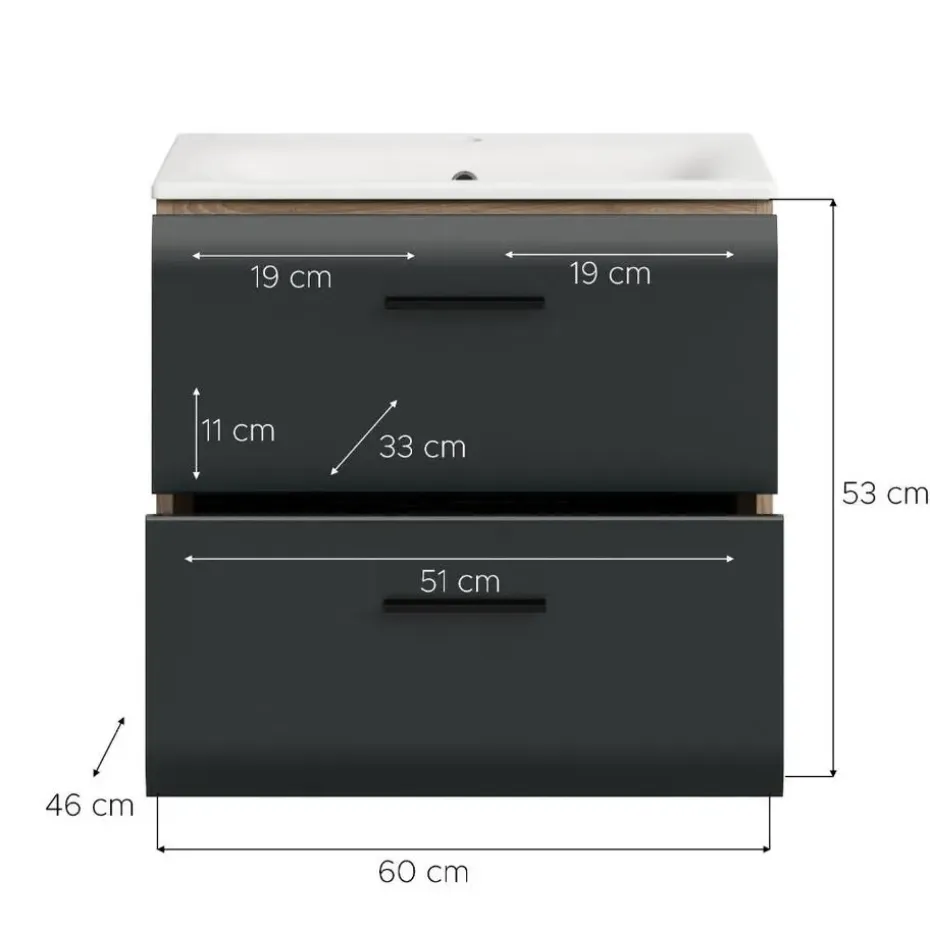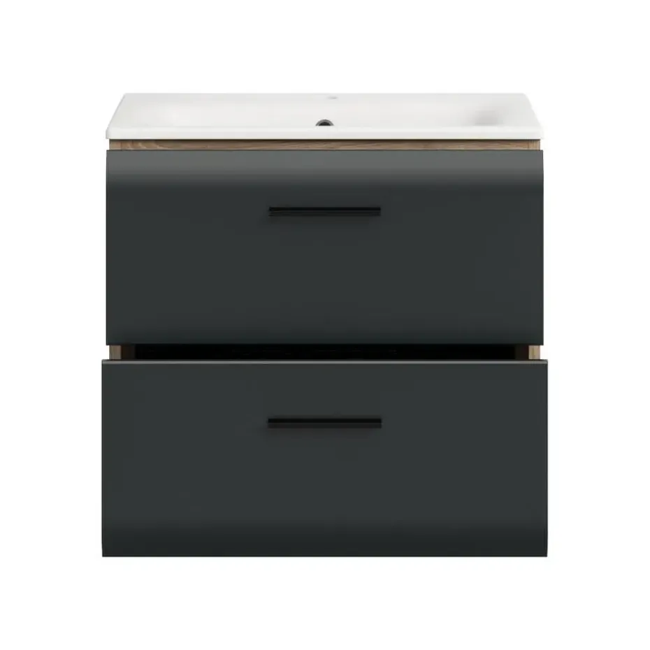 Ice wastafel inclusief was 2 lades zwart mat, eiken decor. Inclusief wastafel. Zonder armatuur. Praktisch en stijlvol: dit wastafelmeubel met keramische inbouwwastafel in matzwart en Nox Oak heeft twee lades voor overzichtelijke opbergruimte. Het hoogwaardige MDF-front met gegroefde frees combineert de tijdloze elegantie van matzwart met de warme houtlook van Nox Oak voor een uitnodigende en overzichtelijke badkamer.