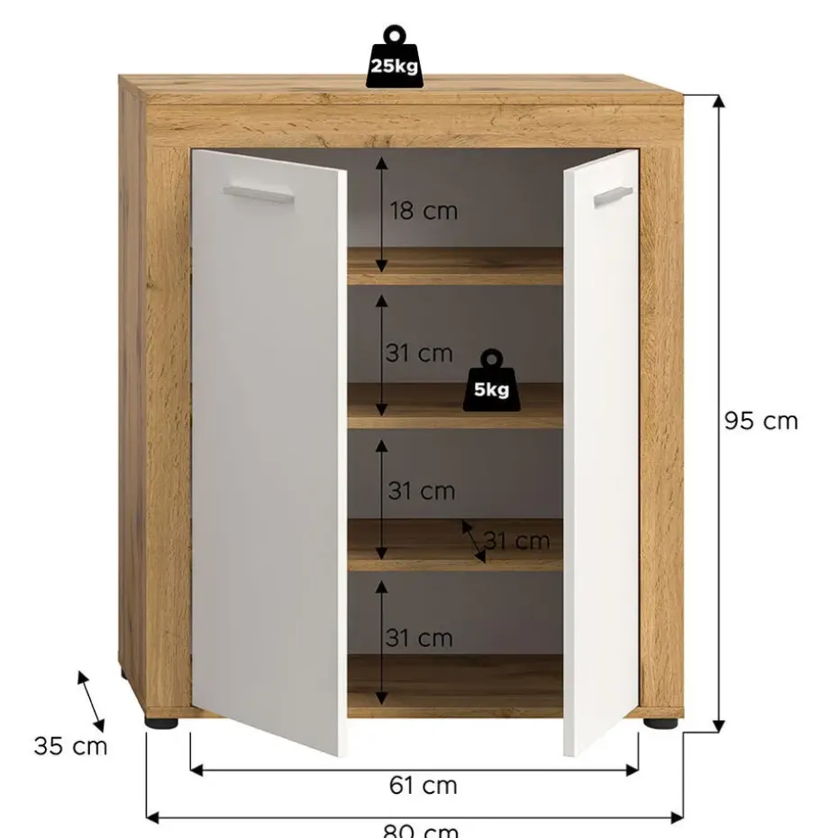 Achter de twee deuren vindt u voldoende opbergruimte voor dagelijkse schoenen, zodat de entree netjes en overzichtelijk blijft. De slanke, metaalkleurige handgrepen zorgen voor gemakkelijke toegang en de zwarte pootjes tillen de kast gemakkelijk van de vloer, wat schoonmaken vergemakkelijkt. Het compacte formaat maakt de kast gemakkelijk te plaatsen, zelfs in kleinere ruimtes.