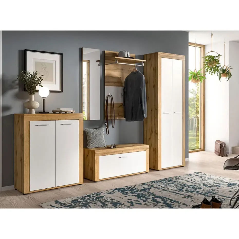 De Jam schoenenkast met 2 deuren combineert functionaliteit met een moderne en warme uitstraling. De kast heeft witte fronten en een decoratief frame in eikenlook, wat zorgt voor een natuurlijk en uitnodigend contrast. Met zijn eenvoudige design past de kast perfect in zowel moderne als klassieke entrees.