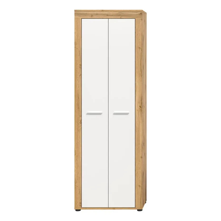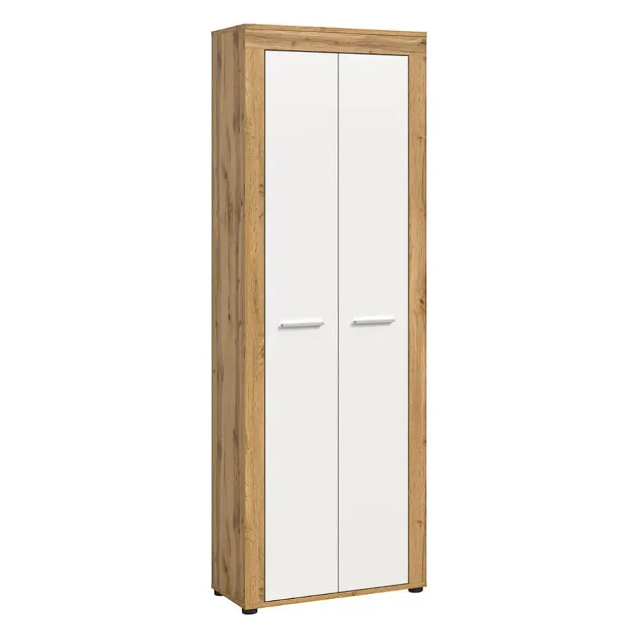 De Jam schoenenkast met 2 deuren in wit en eikenhout is de ideale oplossing voor wie zowel functionele opbergruimte als een harmonieuze uitstraling in de hal wil. De hoge en slanke vorm van de kast biedt voldoende ruimte voor meerdere schoenenparen, zonder onnodig vloeroppervlak in beslag te nemen. De combinatie van witte fronten en eikenhout zorgt voor een warm en modern contrast dat past bij zowel lichte als meer natuurlijke interieurs.