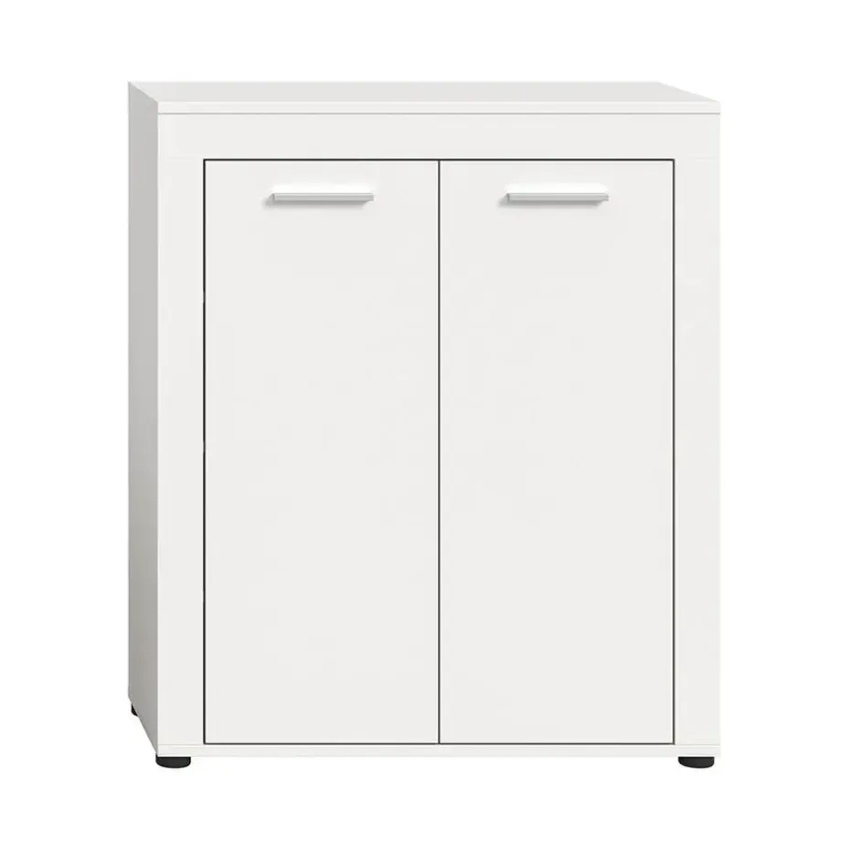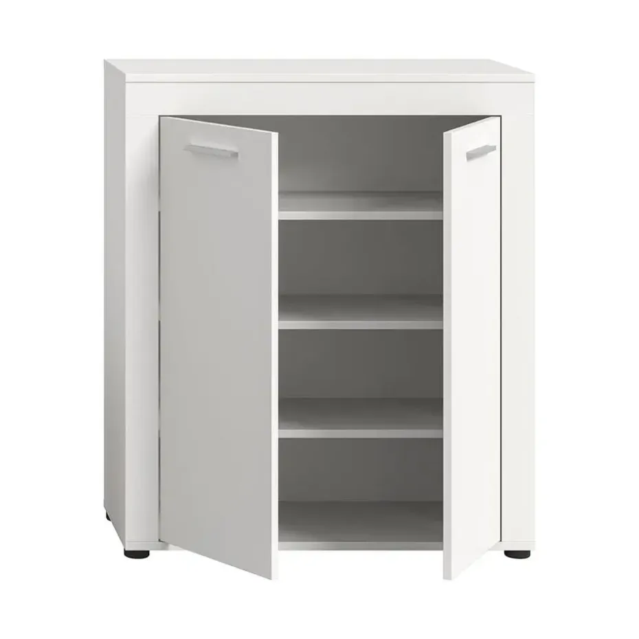 De Jam schoenenkast is een praktische en stijlvolle oplossing voor het opbergen van schoenen in de hal, garderobe of slaapkamer. Met zijn eenvoudige ontwerp en witte afwerking past de kast gemakkelijk in vele interieurs – van modern tot klassiek. De twee deuren openen met discrete, metaalkleurige handgrepen en geven toegang tot een ruim interieur waar je schoenen netjes geordend en beschermd kunnen worden.