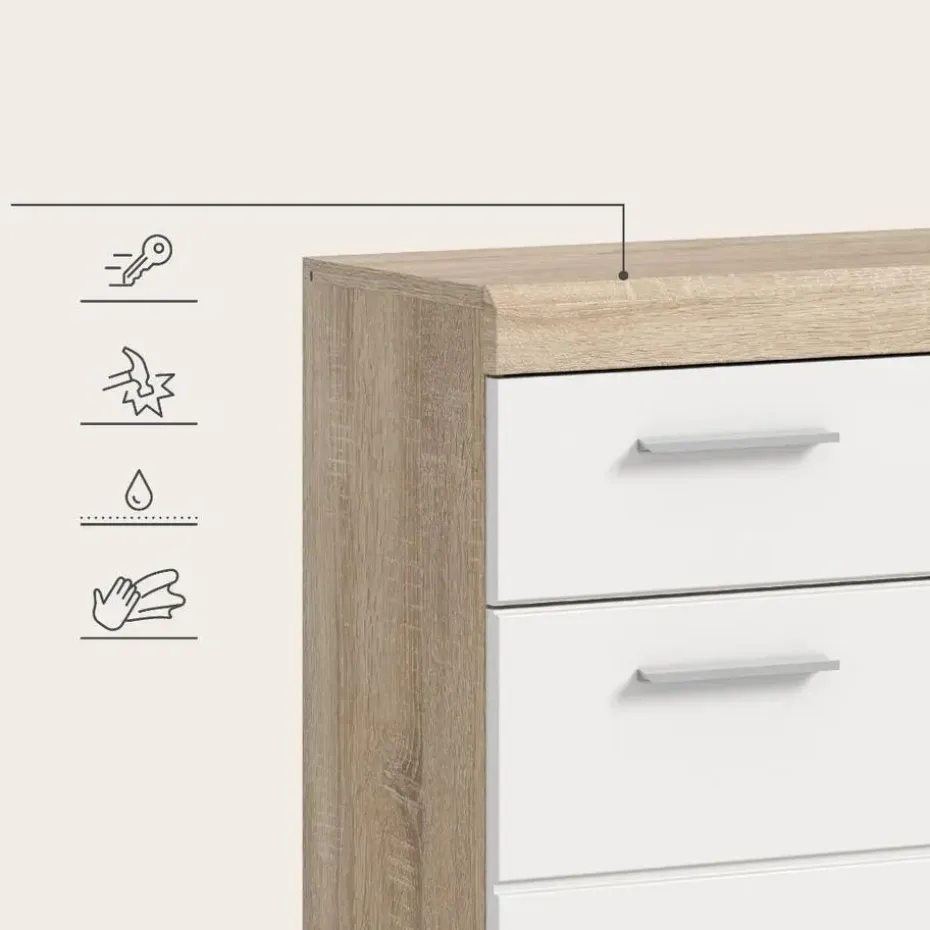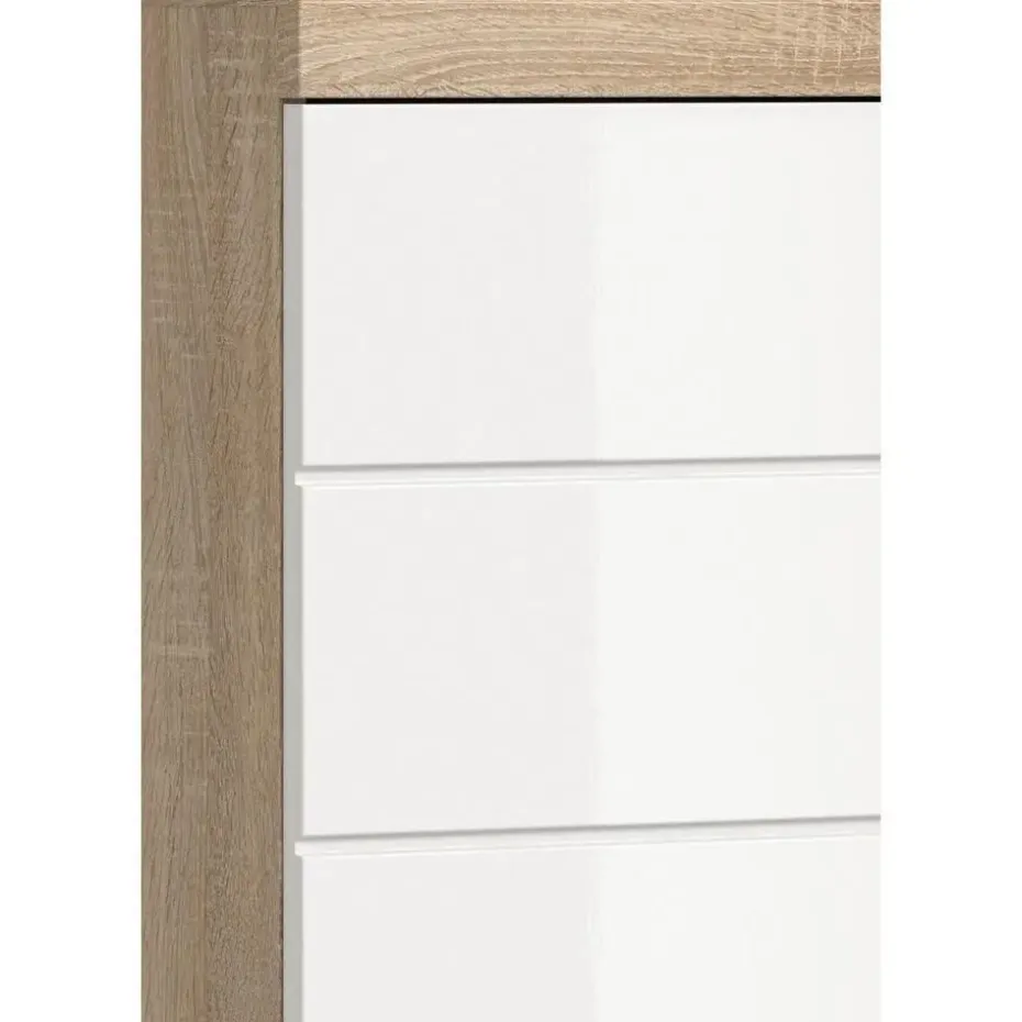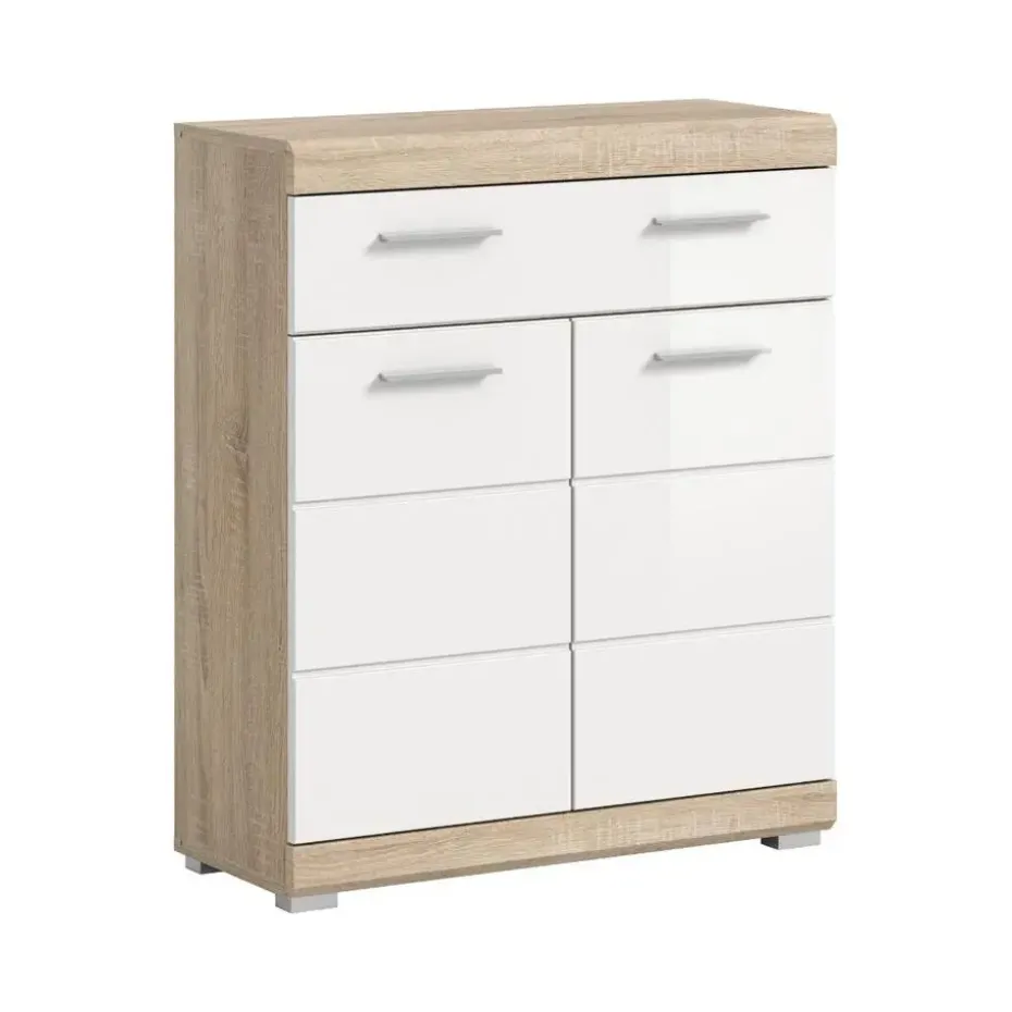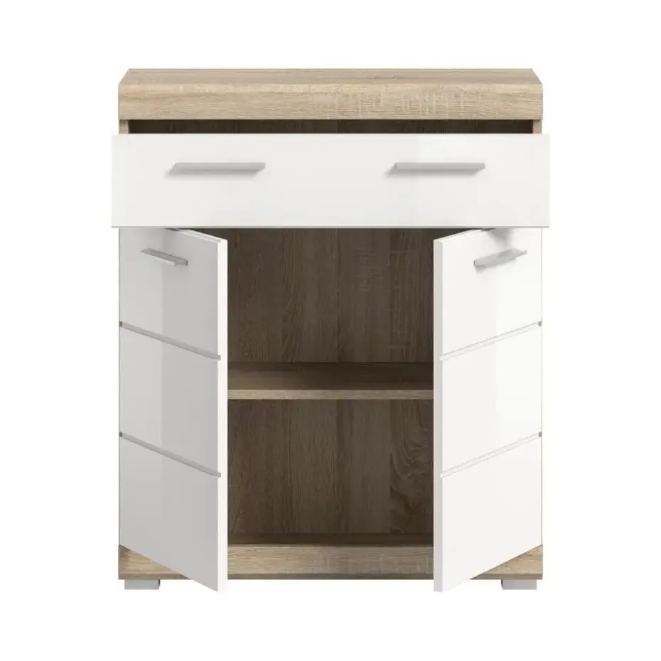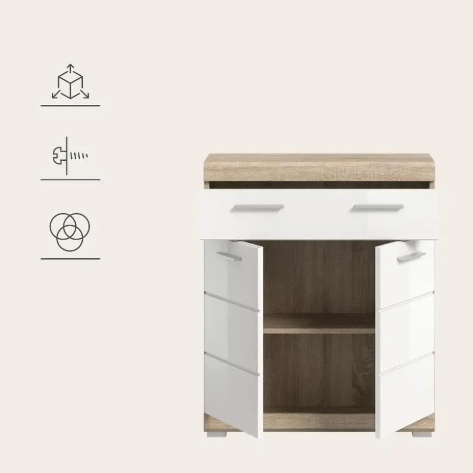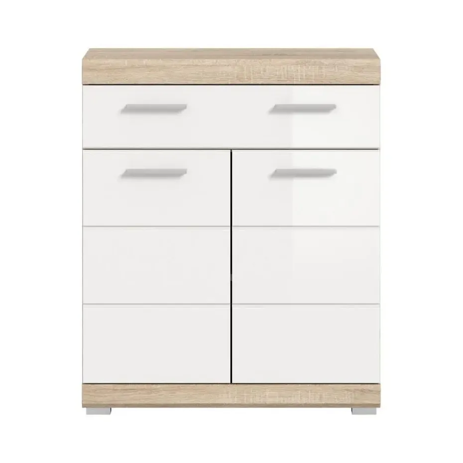 Lambada badkamerkast 2 deuren, 1 lade wit hoogglans, eiken decor. Lade volledig uittrekbaar. In ons trendy assortiment presenteren we een badkamerkast in een moderne, gerookt zilveren afwerking met een hoogglans wit, diepgetrokken oppervlak dat uw badkamer een moderne touch geeft. Met de compacte afmetingen van 74 x 88 x 31 cm biedt hij niet alleen praktische opbergruimte, maar ook een stijlvol design. Ervaar de perfecte combinatie van functionaliteit en trendy look met deze modieuze kast.