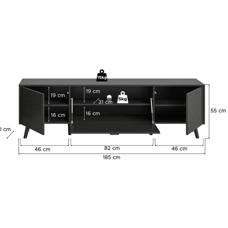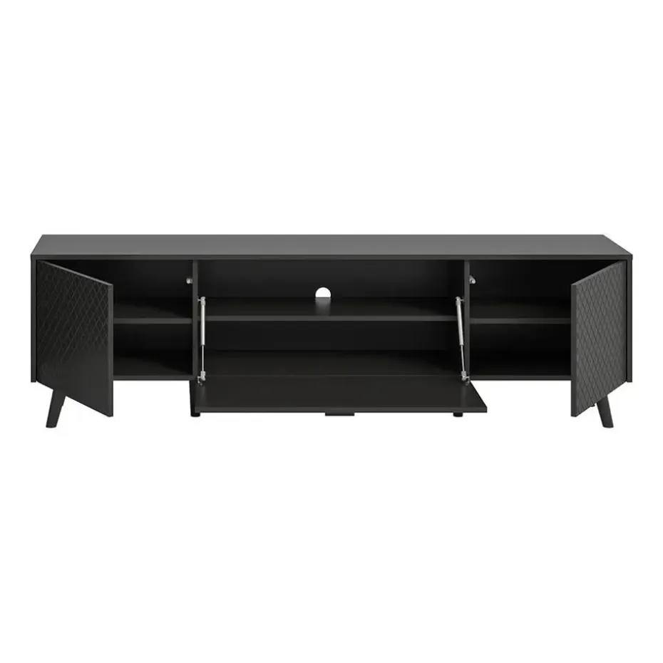 Het dressoir is voorzien van twee deuren en een praktische vouwdeur in het midden, die voldoende ruimte biedt voor zowel verborgen opbergruimte als elektronische apparatuur. Het ruime oppervlak is geschikt voor tv’s tot 75 inch en achter de deuren bevinden zich planken die zorgen voor een georganiseerde oplossing voor alles, van boeken en films tot kabels en media-apparaten.
