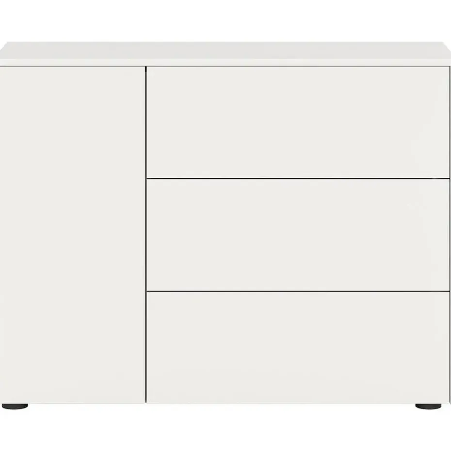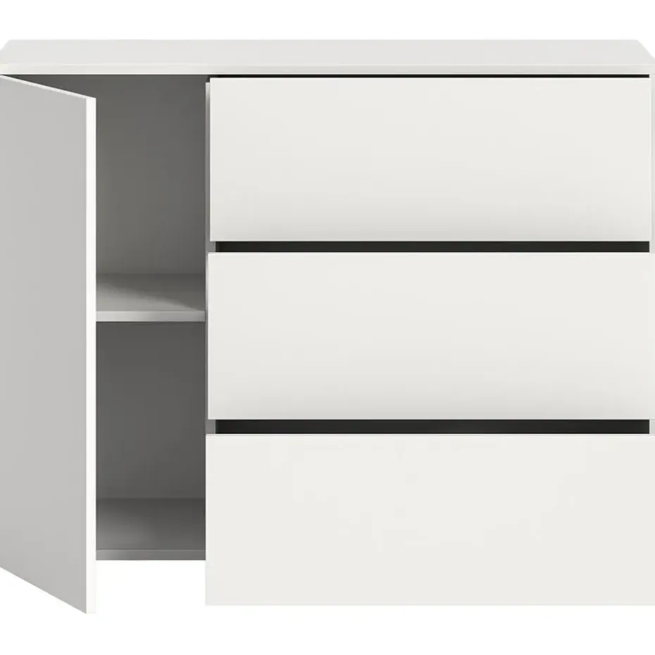 Loft dressoir 3 laden 1 deur wit. Deur Duw om te openen. Losse planken: 1. Dit moderne opbergmeubel biedt een praktische combinatie van planken en lades voor opbergruimte. Met een stijlvol ontwerp en compacte afmetingen is hij ideaal voor zowel kleine als grote kamers. Het wit gelakte oppervlak geeft een strakke en minimalistische uitstraling die perfect past in woonkamers, kantoren en slaapkamers.