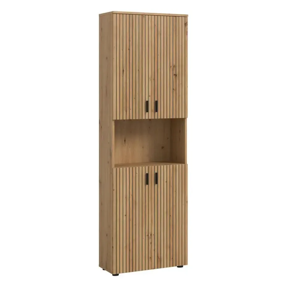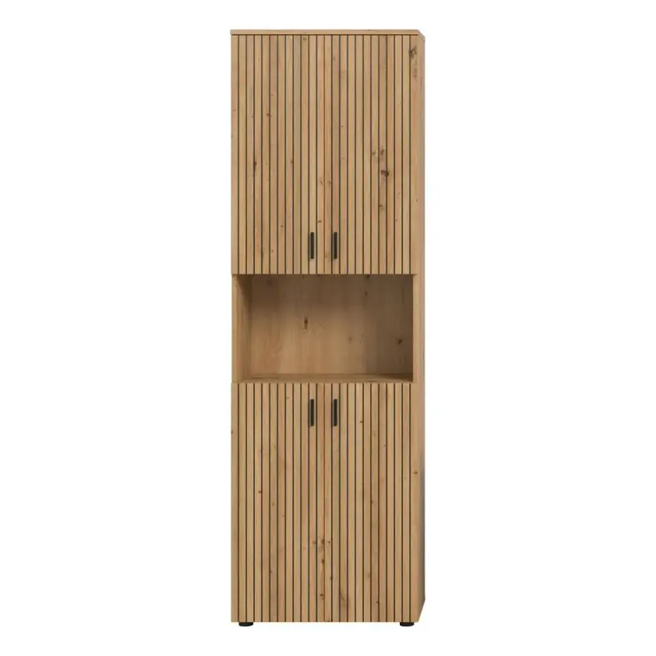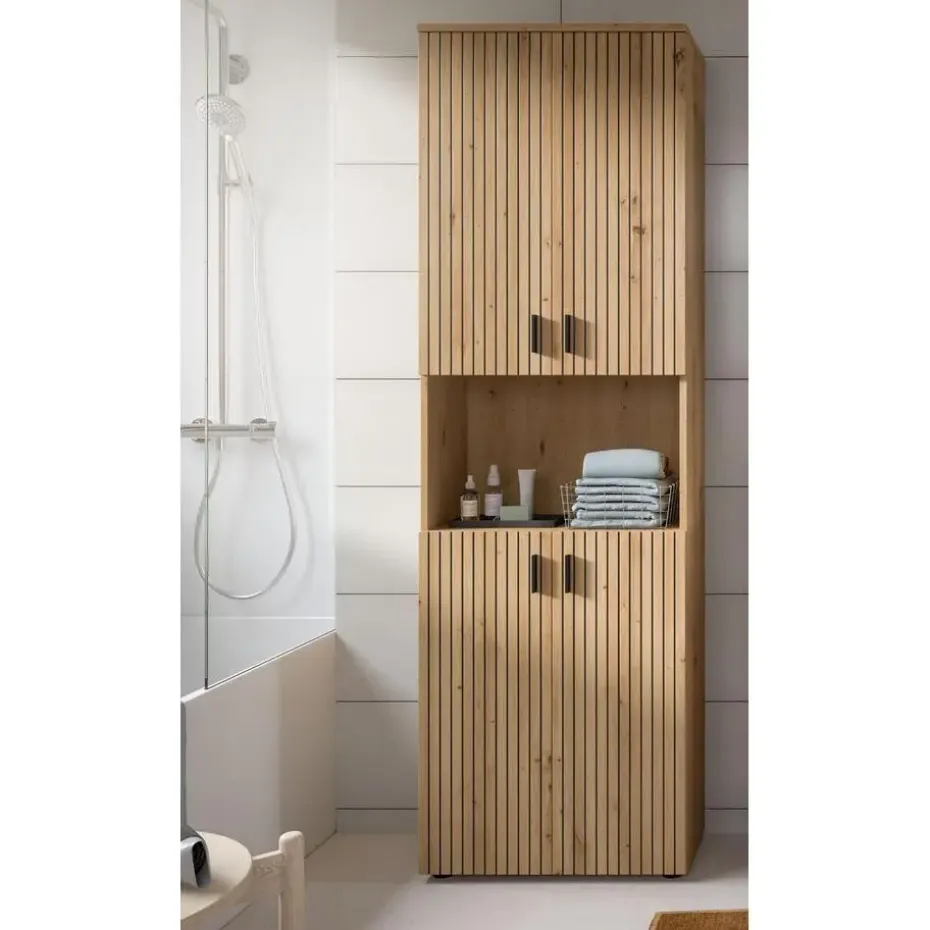 Mone kolomkast 4 deuren, 1 plank eiken decor. Deze ruime badkamerkast in Artisan Oak-afwerking (60 x 192 x 30 cm) biedt met vier deuren, vier in hoogte verstelbare planken, acht gesloten vakken en één open vak voldoende opbergruimte voor al uw badkamerartikelen. Het onderhoudsvriendelijke front met gefreesd paneeldesign is van hoge kwaliteit en geeft uw badkamer een warme en natuurlijke uitstraling. Dankzij de robuuste constructie en de flexibele binnenindeling kunt u de kast perfect aanpassen aan uw wensen. De combinatie van functionaliteit en stijlvol design maakt deze badkamerkast tot een onmisbaar meubelstuk voor een opgeruimde en moderne badkamer. De meubelserie biedt diverse combinatiemogelijkheden om uw badkamer te personaliseren en in te richten.
