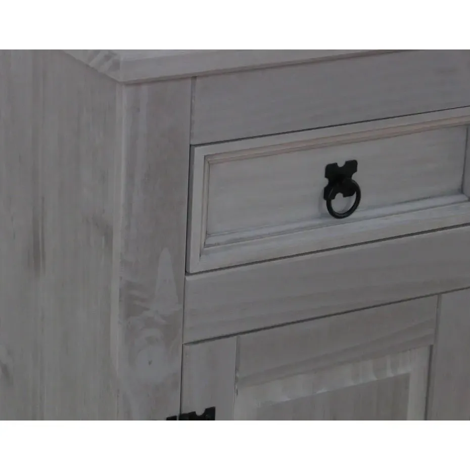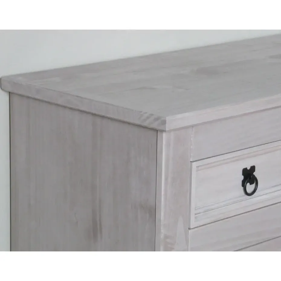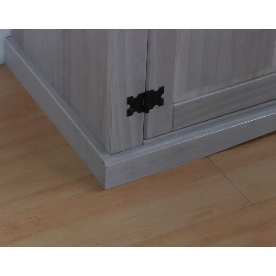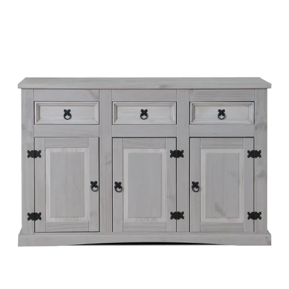 New Mexico dressoir breedte 132 cm, hoogte 84 cm met 3 lades en 3 deuren grijs is een dressoir in nan kleur dat zowel stijl als functionaliteit in je huis brengt. Ruim mooi dressoir in grijs met 3 deuren en 3 lades in antieke stijl uit onze meubelserie “Mexico”. Het dressoir is uitgevoerd in massief grenen, dat een grijze/waxbehandeling heeft ondergaan. Door de grijze kleur zie je de houtstructuur. Achter de deuren vind je 1 doorlopende losse plank. Het dressoir oogt solide en van goede kwaliteit. Dit product is gemaakt met oog voor detail, wat zowel esthetische aantrekkingskracht als hoge duurzaamheid garandeert. Het is ontworpen met zowel functionaliteit als stijl in gedachten, waardoor het de perfecte keuze is voor elke kamer in uw huis. De gebruikte materialen zijn van hoge kwaliteit, waardoor het product een lange levensduur heeft en bestand is tegen dagelijks gebruik. Of het nu voor opslag is of als decoratieve toevoeging, dit product zal uw interieur naar een hoger niveau tillen en extra comfort en elegantie in uw huis brengen.