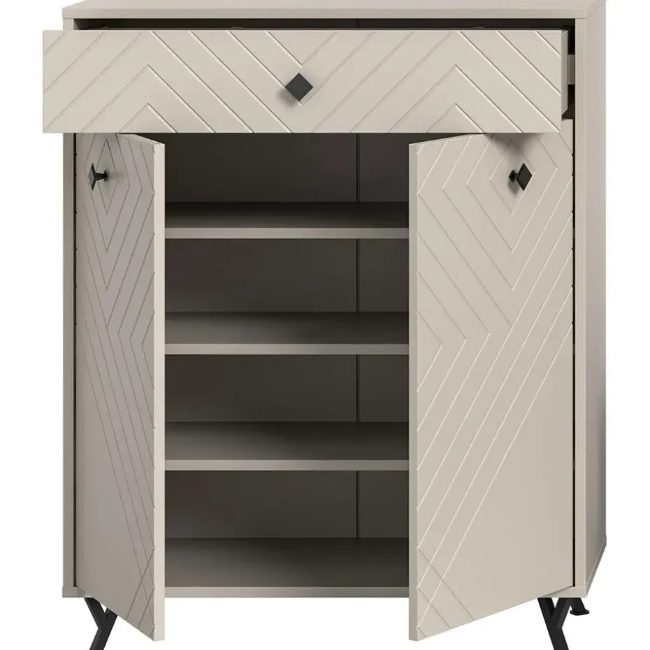 Opmerkingen schoenenkast 2 deuren mat beige. Losse planken: 3. Deze moderne opbergkast combineert functionaliteit en stijl in een elegant design. Met zijn praktische opbergoplossing, waaronder een ruime lade en verschillende planken, biedt deze kast je voldoende ruimte om kleding, schoenen of andere spullen te ordenen. De verfijnde geometrische decoratie op de deuren en lade, evenals de elegante poten, maken dit kastje tot een perfecte aanvulling op je huis. De kast is ideaal om orde en stijl te brengen in uw slaapkamer, hal of woonkamer.