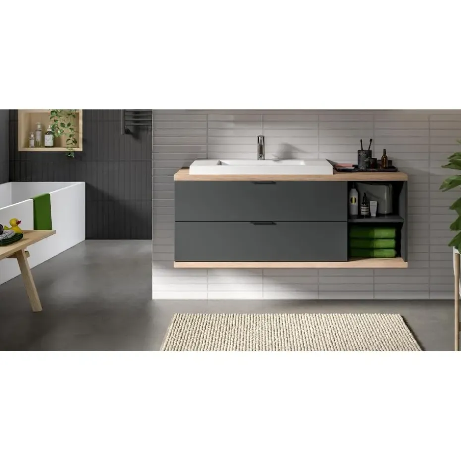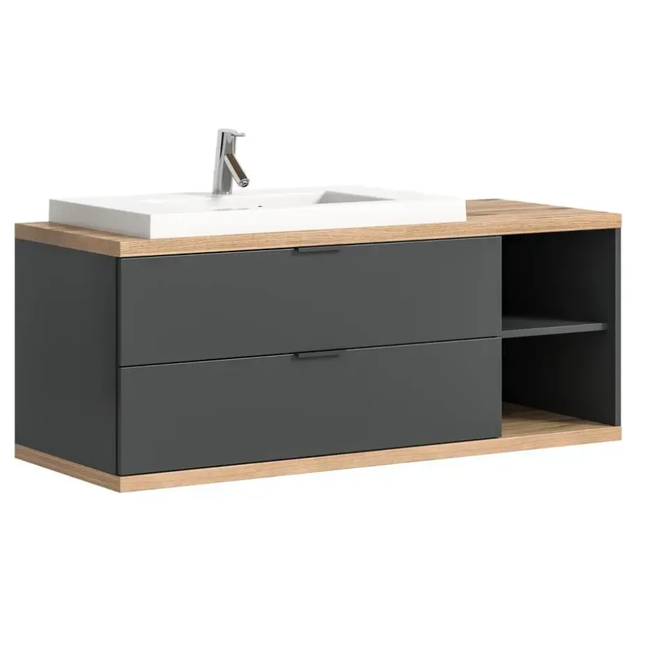 Nuaro wastafel 2 lades grijs. Inclusief wastafel. Zonder armatuur. Lade volledig uitschuifbaar. Transformeer uw badkamer met onze ruime wastafelmeubel in een elegante antracietgrijze afwerking. Met afmetingen van 130 x 55 x 48 cm biedt hij niet alleen veel opbergruimte, maar geeft hij uw ruimte ook een moderne en stijlvolle sfeer. Ontdek de perfecte combinatie van functionaliteit en esthetiek voor uw badkamer.