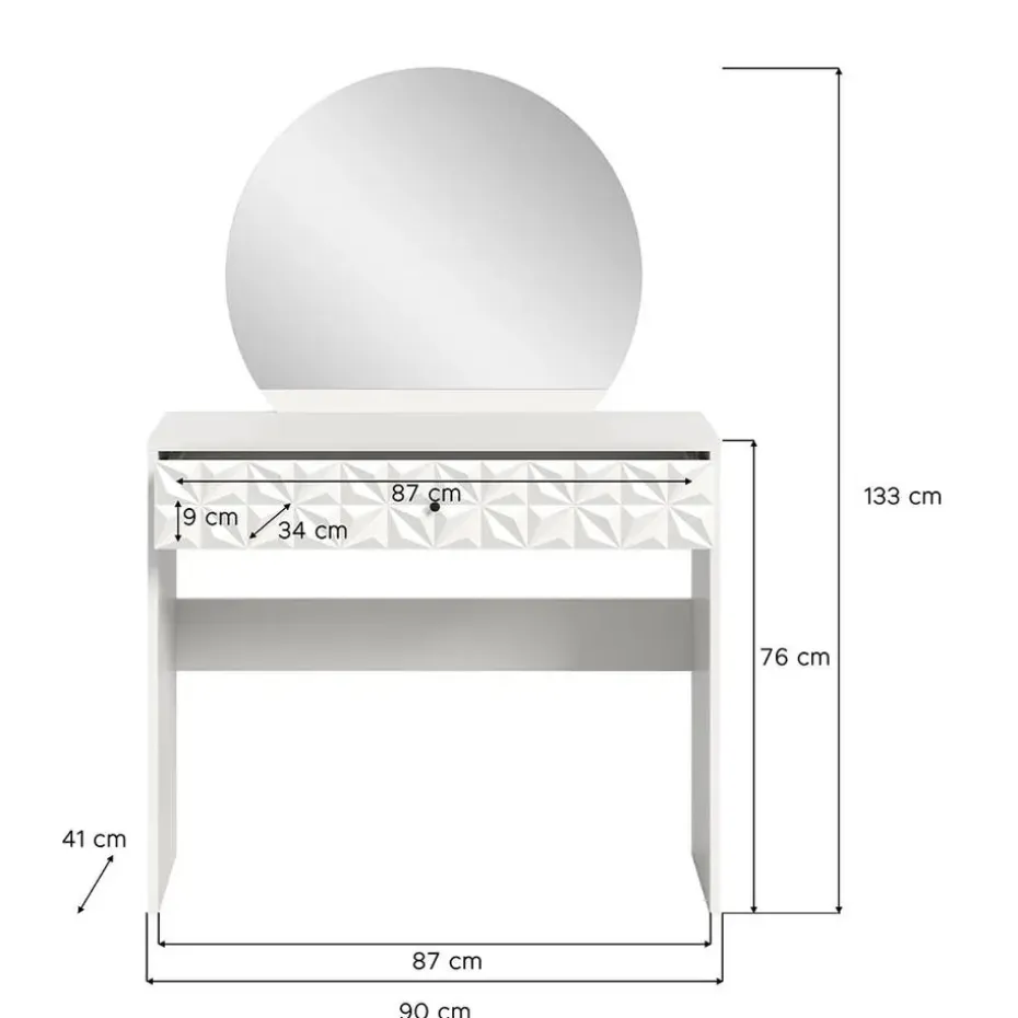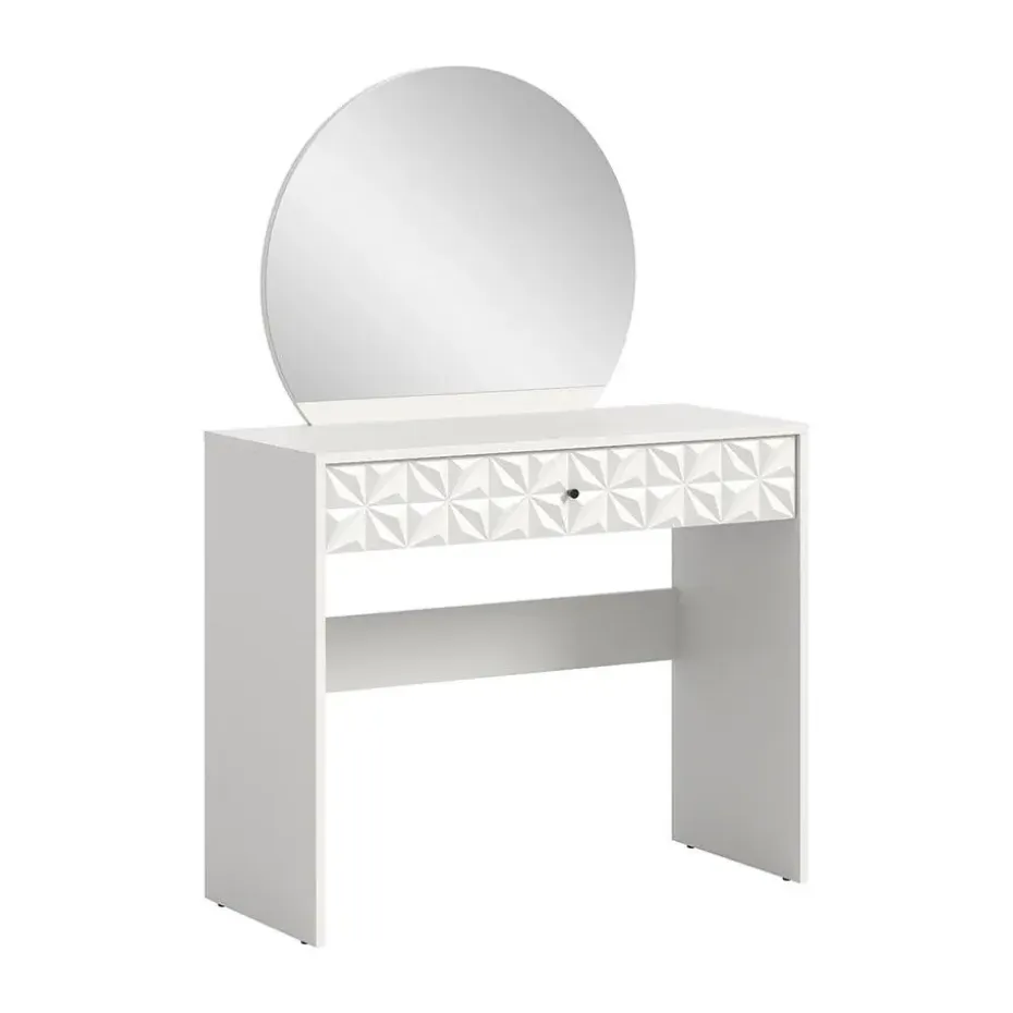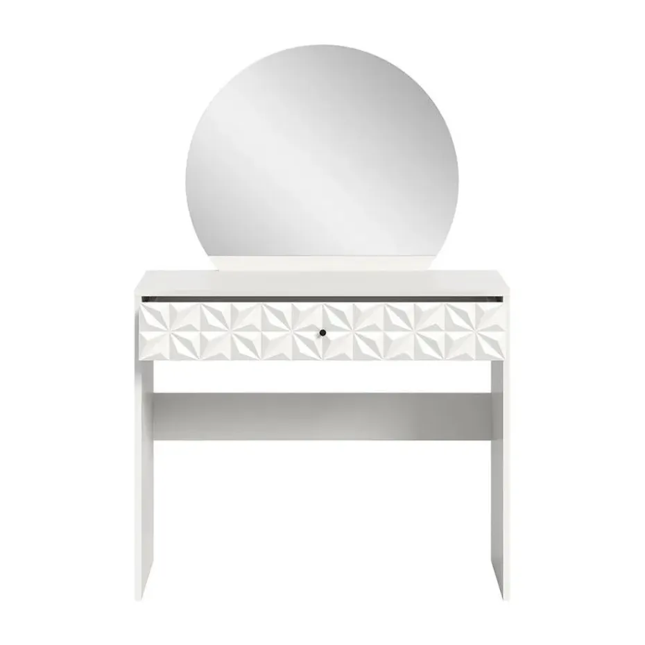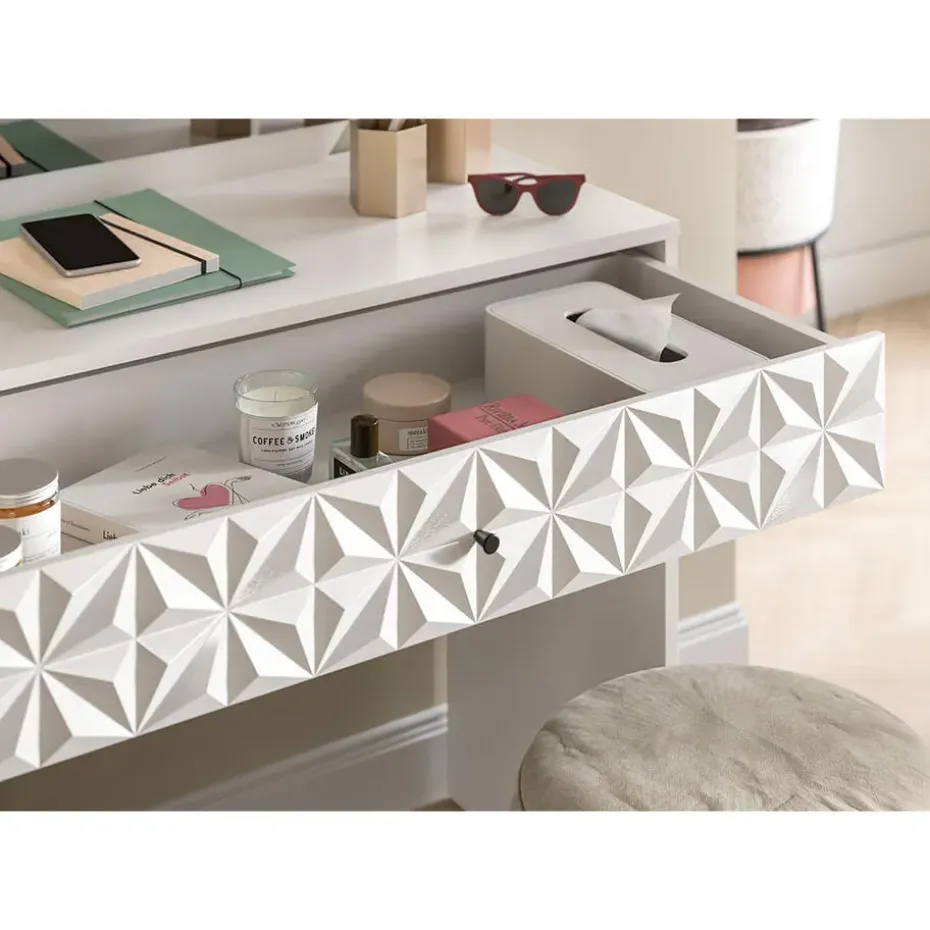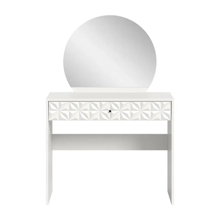 De brede lade met 3D-patroon aan de voorkant biedt voldoende ruimte voor het opbergen van make-up, sieraden en accessoires, zodat je alles georganiseerd en bij de hand hebt. De grote, ronde spiegel voegt zowel karakter als functionaliteit toe en maakt dagelijkse styling gemakkelijk en comfortabel.
