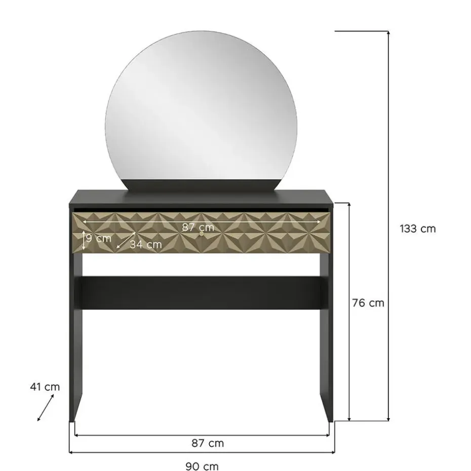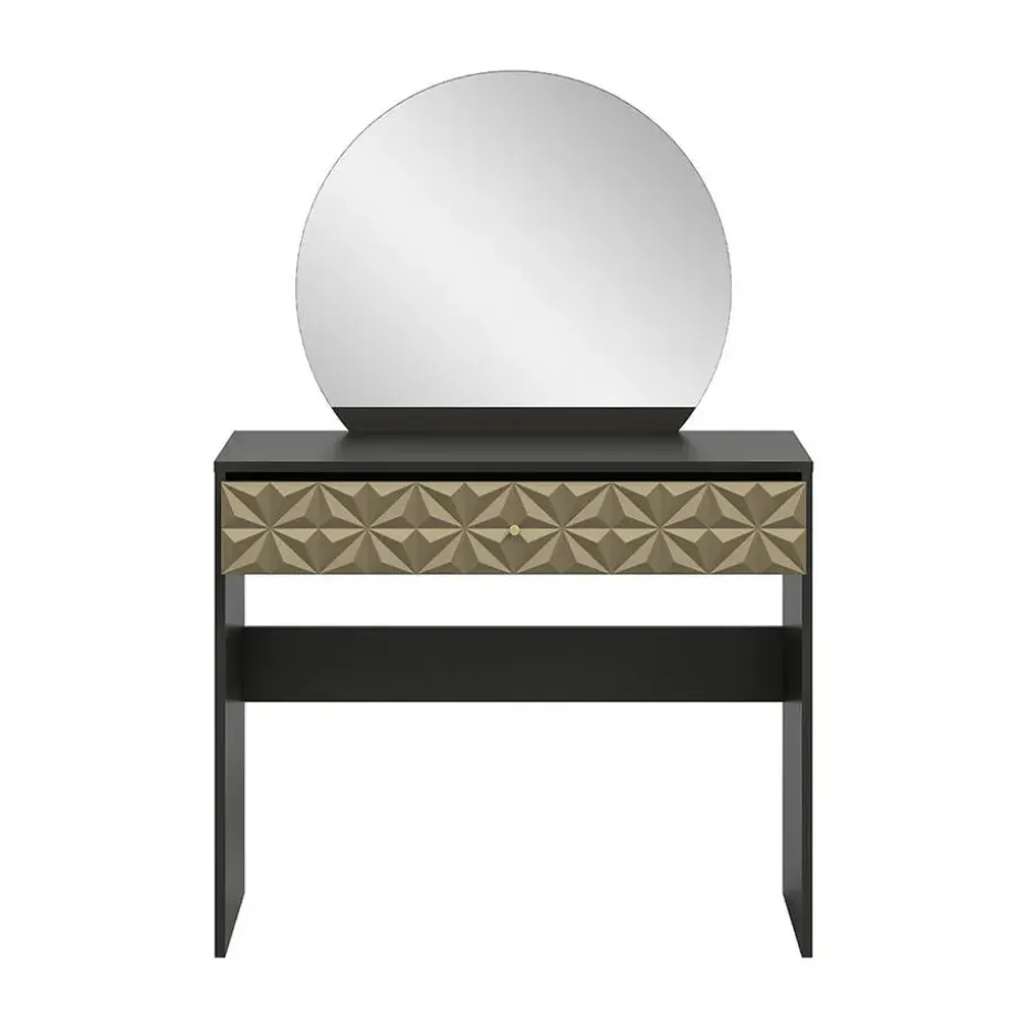 De Prisma kaptafel combineert functionaliteit met verfijnde elegantie. Het zwarte oppervlak geeft een moderne en stijlvolle uitstraling, terwijl het goudkleurige ladefront met 3D-patroon een exclusieve touch toevoegt die de aandacht trekt en diepte aan de kamer toevoegt.