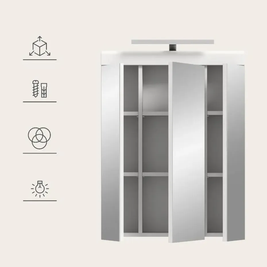 Scout spiegelkast inclusief verlichting 2 deuren, 3 spiegeldeuren, 3 planken wit hoogglans, wit. Deur omkeerbaar. LED. 6 kWh/1000h. 400 Lumen. 6 Watt. 30.000 uur. Kelvin 5000. EEF: G. LED kan niet worden vervangen. In ons trendy assortiment vindt u de ultieme badkamerspiegelkast met geïntegreerde verlichting, met een stijlvolle witte afwerking en een hoogglanzend, diepgetrokken oppervlak. Met afmetingen van 60 x 79 x 18 cm is het niet alleen een functionele spiegel, maar ook een stijlvolle accessoire voor uw badkamer. Ervaar de perfecte combinatie van modern design, praktisch gebruik en sfeervolle verlichting met onze trendy spiegelkast.