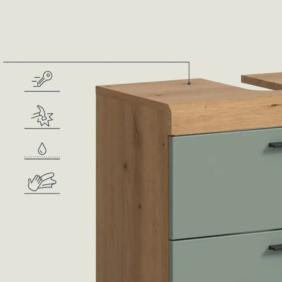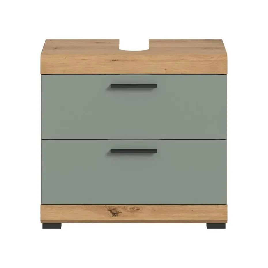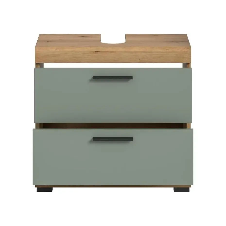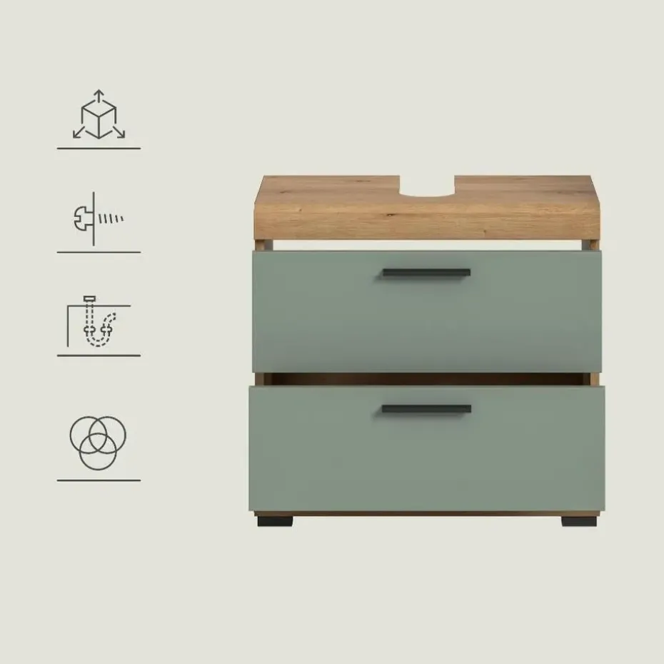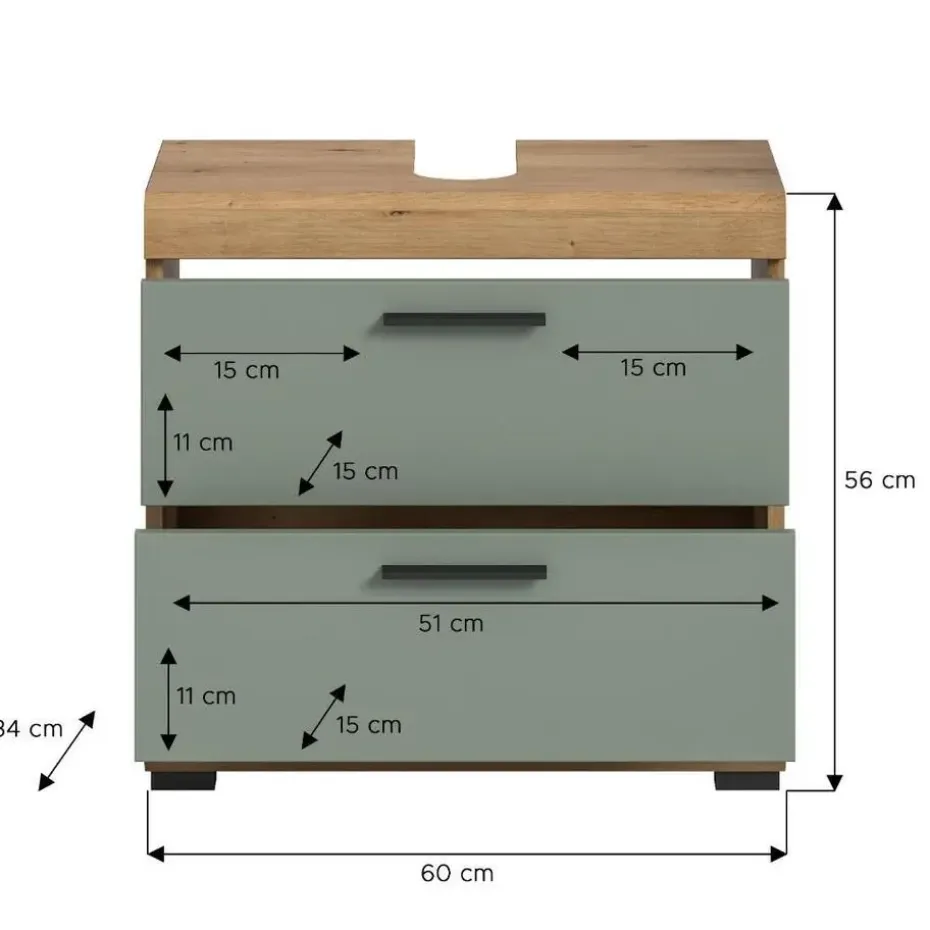 Scout wastafel 2 deuren, 2 lades, 2 planken salvie decor, eiken decor. Zonder wastafel. Deur omkeerbaar. Lade volledig uitschuifbaar. In ons moderne assortiment presenteren we een badkamerkast in een trendy saliegroene afwerking met details in handgemaakt eikenhout die uw badkamer een moderne look geven. Met compacte afmetingen van 60 x 56 x 34 cm biedt hij niet alleen praktische opbergruimte, maar ook een stijlvol design. Ervaar de perfecte combinatie van functionaliteit en trendy elegantie met deze modieuze badkamerkast.