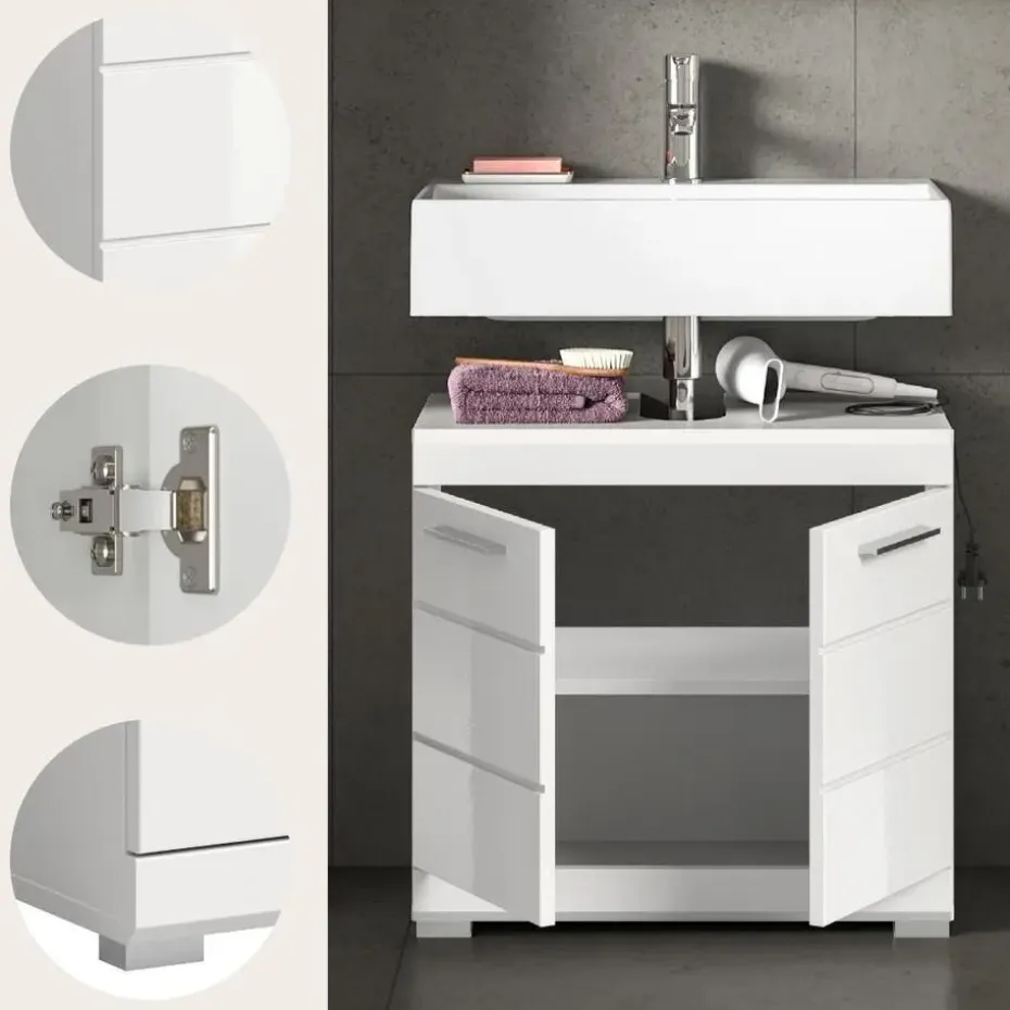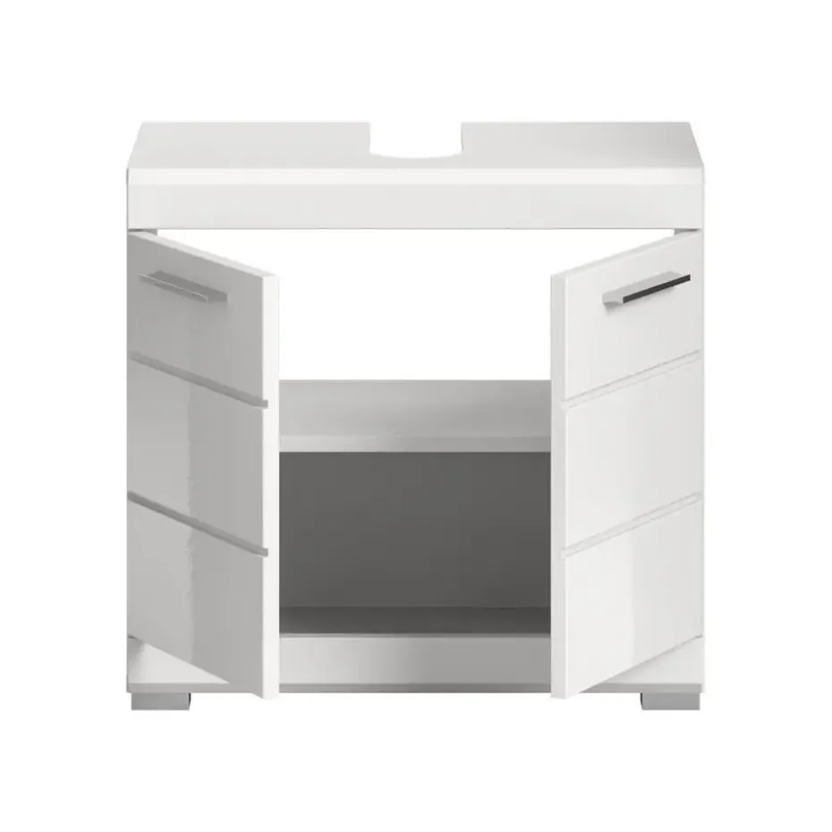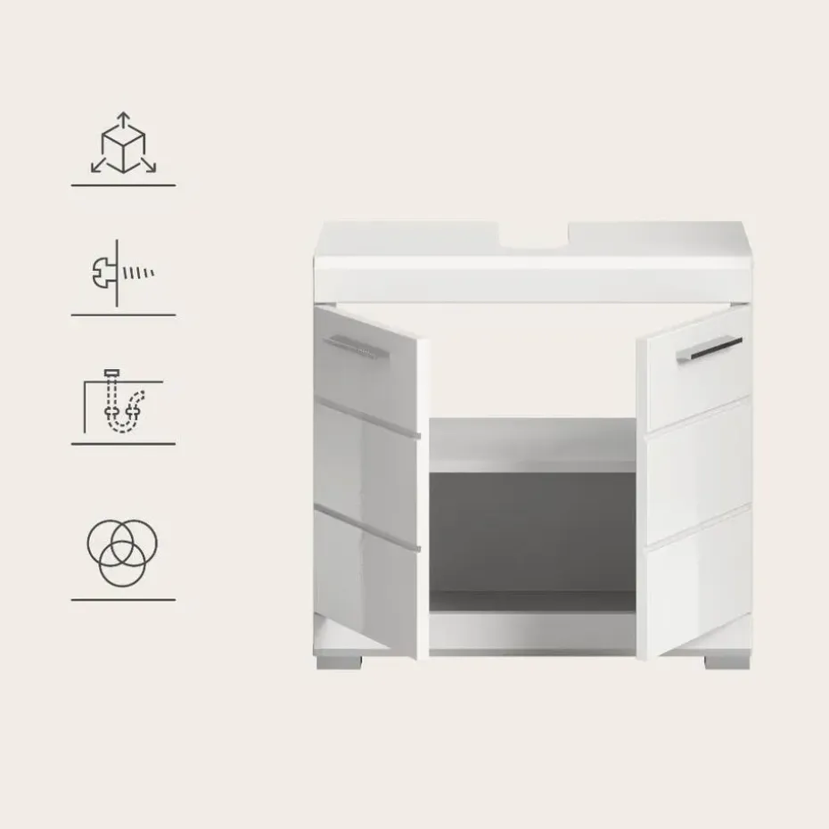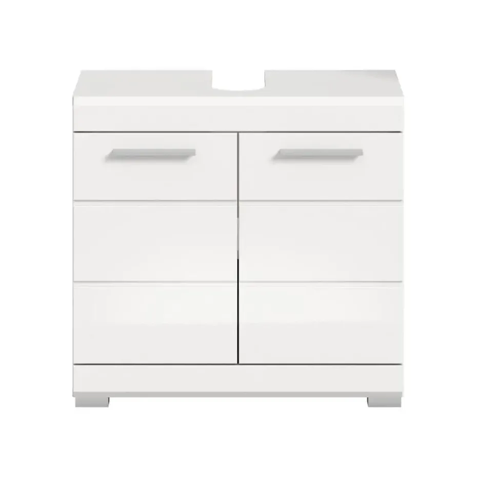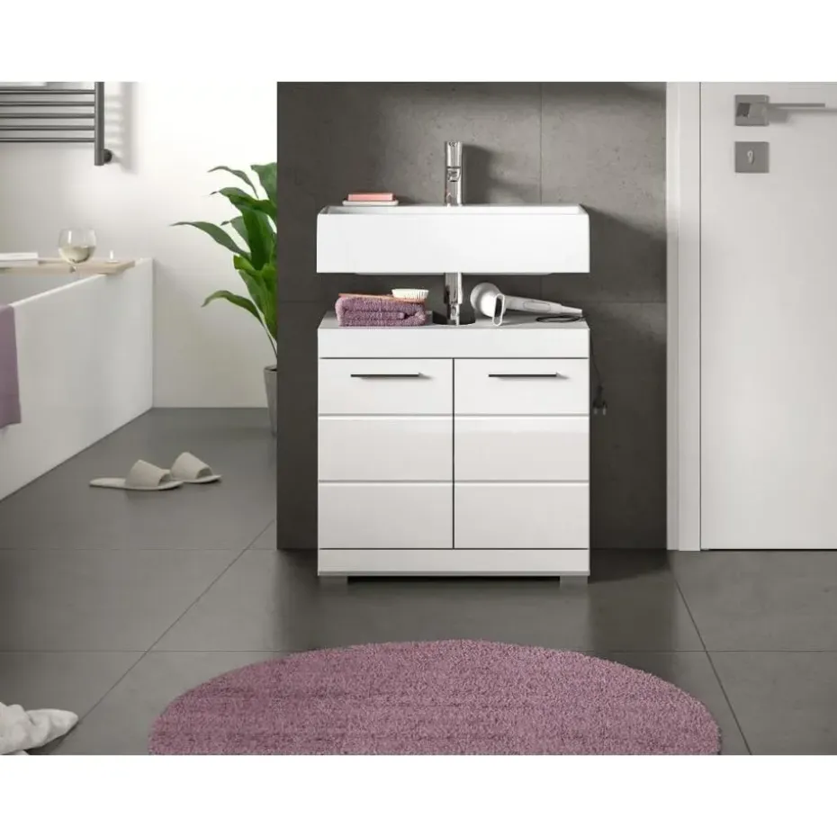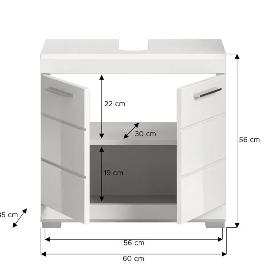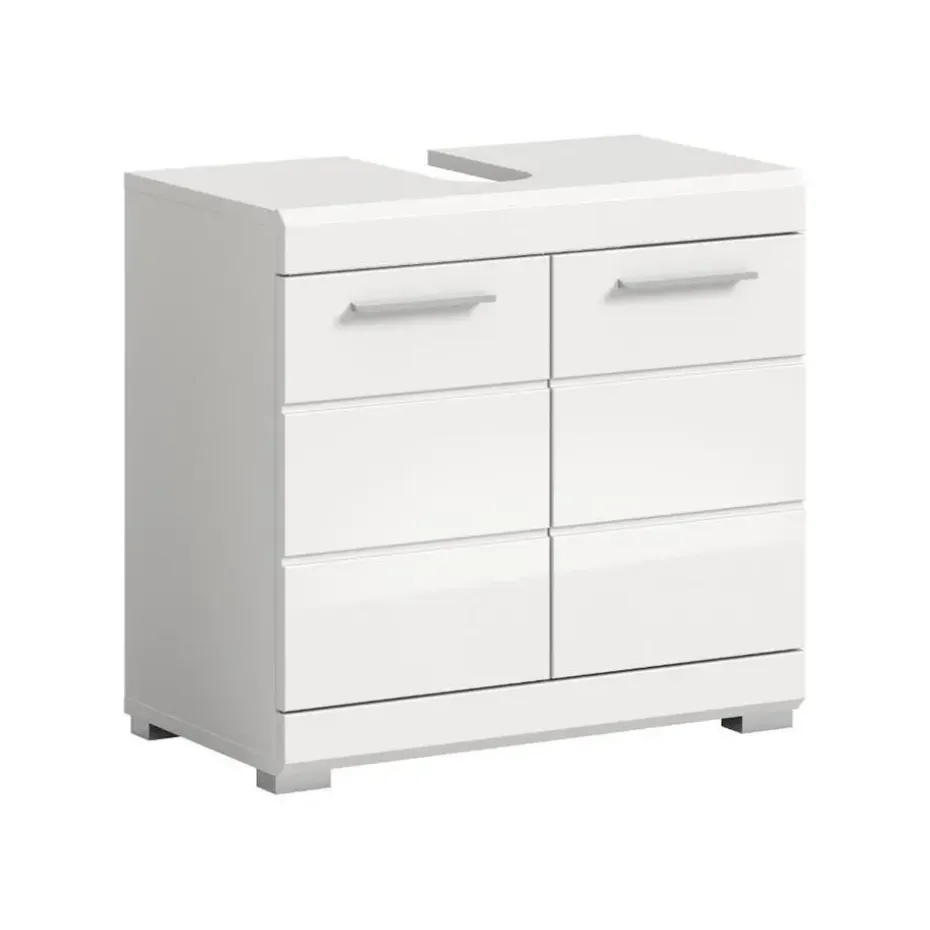 Scout wastafel 2 deuren, 2 lades wit hoogglans, wit. Zonder wastafel. Lade volledig uitschuifbaar. In ons moderne assortiment presenteren we een badkamerkast in trendy wit met een hoogglanzend, diepgetrokken oppervlak dat uw badkamer een moderne uitstraling geeft. Met compacte afmetingen van 60 x 56 x 34 cm biedt hij niet alleen praktische opbergruimte, maar ook een stijlvol design. Ervaar de perfecte combinatie van functionaliteit en trendy elegantie met deze modieuze badkamerkast.
