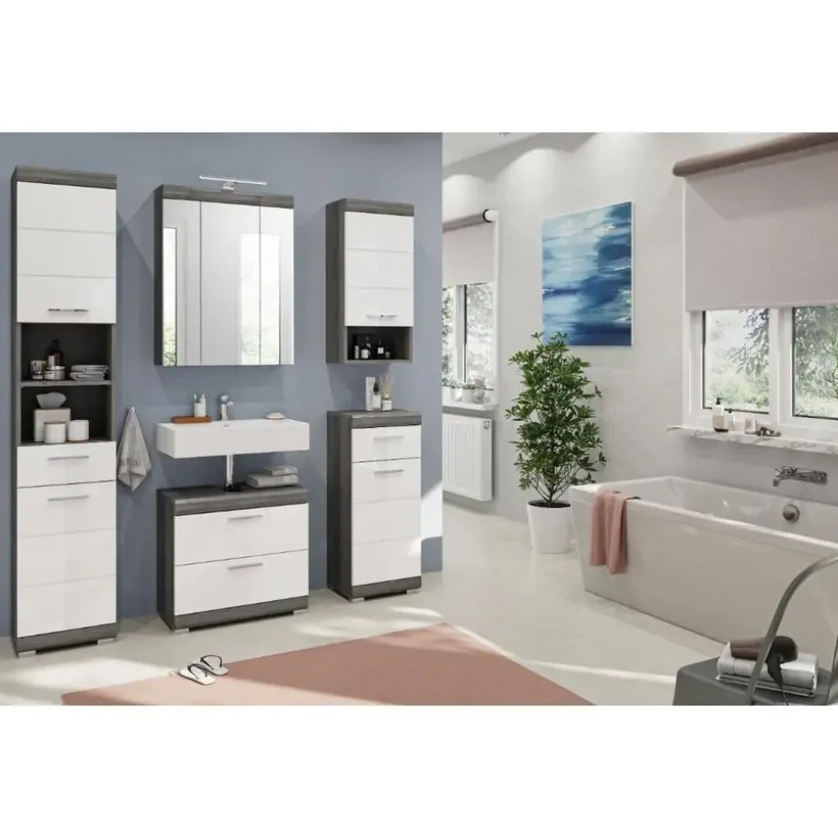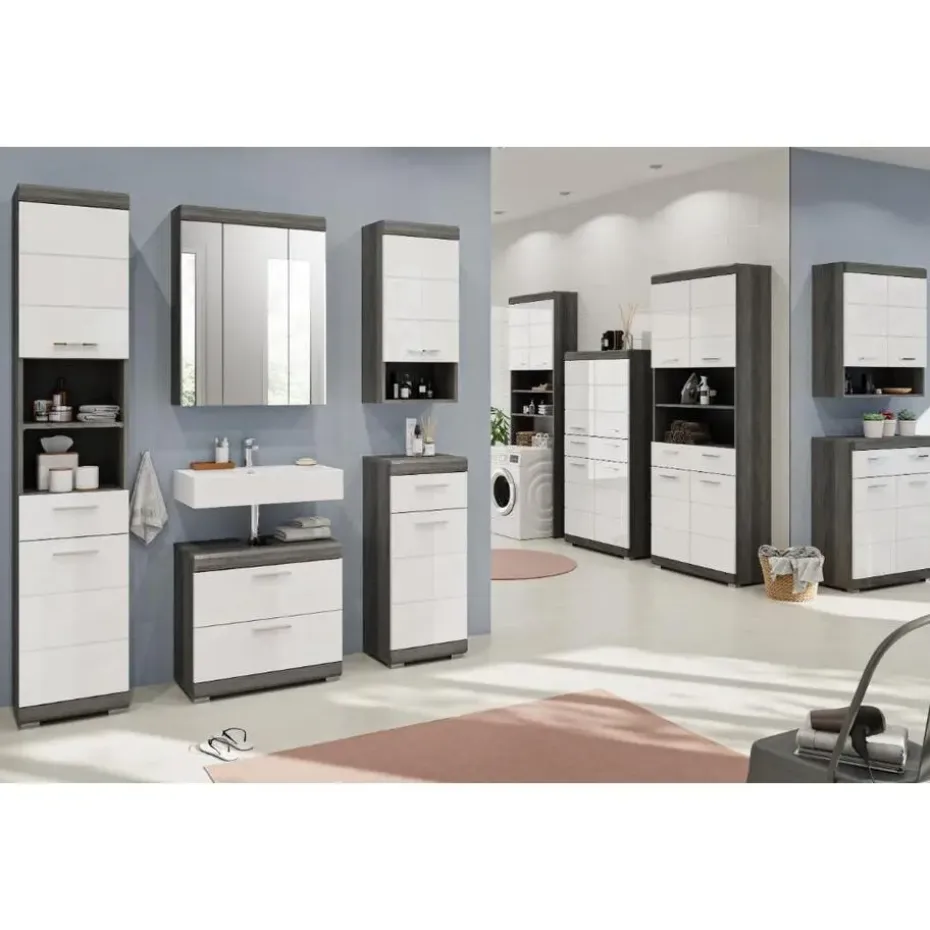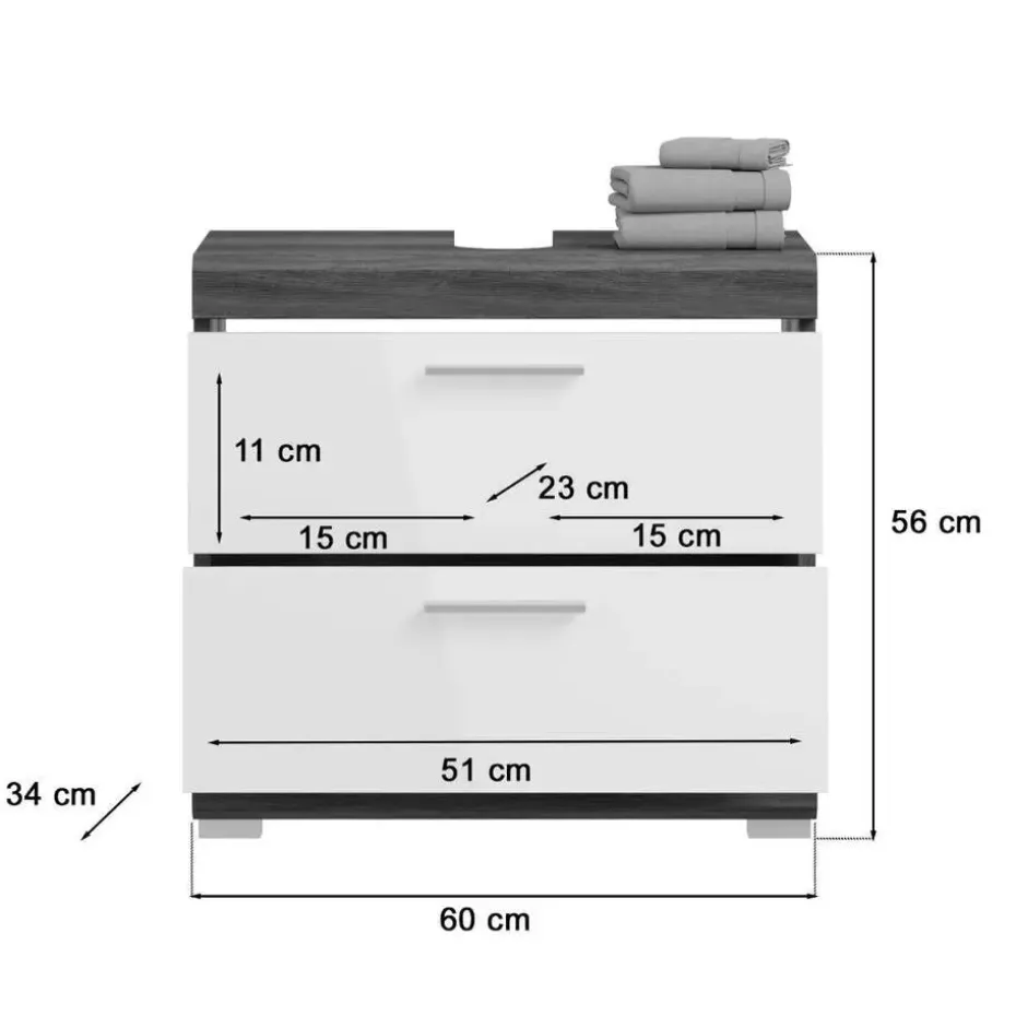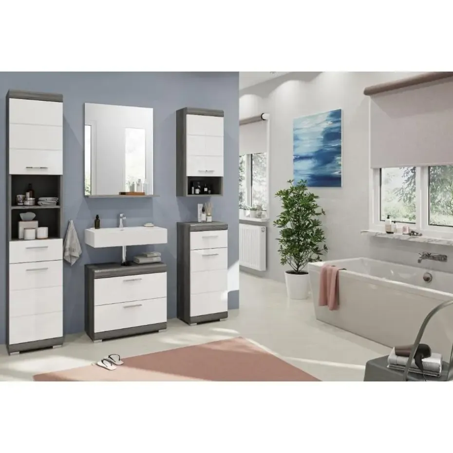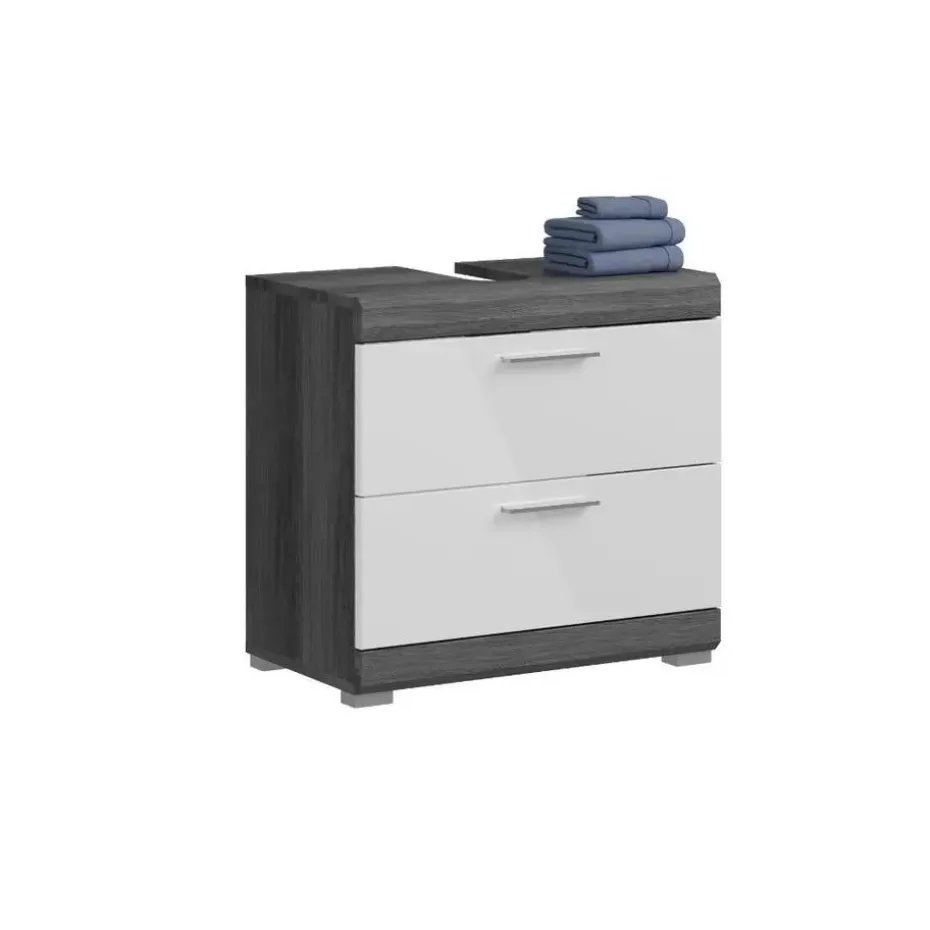 Scout wastafel 2 lades wit hoogglans, grijs. Zonder wastafel. Lade volledig uitschuifbaar. In ons moderne assortiment presenteren we een badkamerkast in een trendy rookzilveren afwerking met een hoogglans wit, diepgetrokken oppervlak dat uw badkamer een moderne uitstraling geeft. Met compacte afmetingen van 60 x 56 x 34 cm biedt hij niet alleen praktische opbergruimte, maar ook een stijlvol design. Ervaar de perfecte combinatie van functionaliteit en trendy elegantie met deze modieuze badkamerkast.