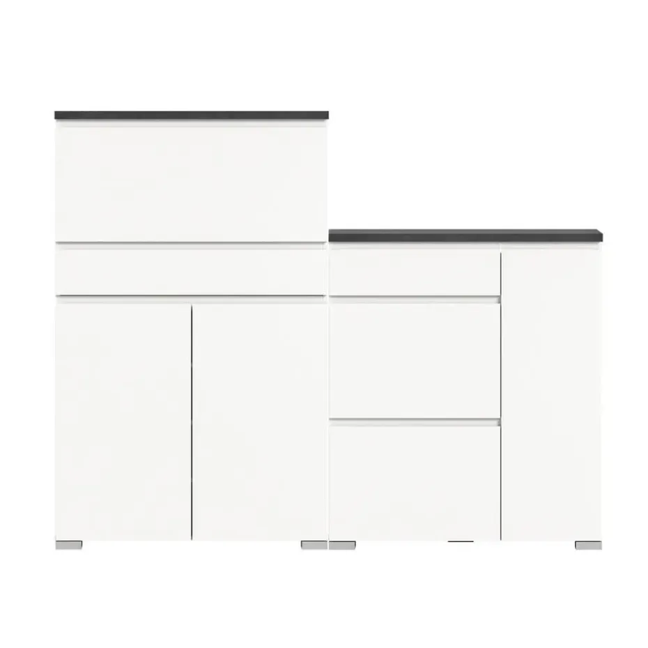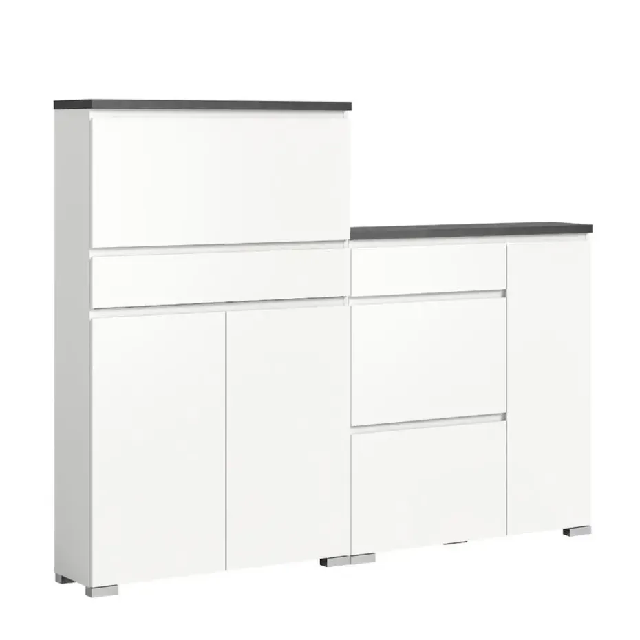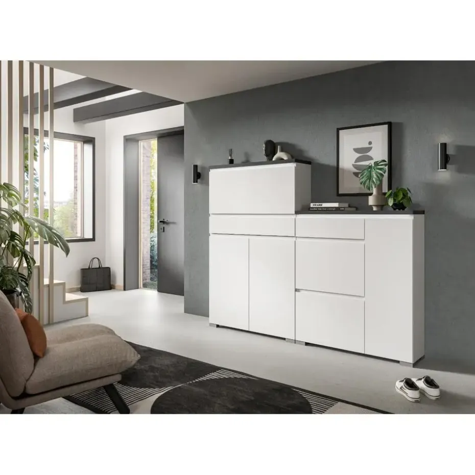 Shoelove schoenenkast set met 2 3 deuren, 2 vouwdeuren, 1 lade wit. Aantal paar schoenen: 24. Deur Softclose. Lade zonder volledige uittrekking. Deze schoenenkastcombinatie (B/H/D: 205x152x27 cm) overtuigt door zijn elegante design en royale opbergruimte. Het moderne witte front met industrieel grijze accenten creëert een tijdloze look die perfect integreert in elk interieur. Productdetails: Afmetingen: B/H/D: 205x152x27 cm – ideaal voor hal of slaapkamer. Design: Stijlvol wit front gecombineerd met industrieel grijze accenten. Opbergruimte: 3 deuren en 2 kleppen bieden voldoende ruimte voor schoenen en accessoires. Functie: Softclose-mechanismen en dempingskleppen zorgen voor een geruisloze en comfortabele sluiting. Duurzame materialen: Dit meubelstuk is gemaakt van FSC®-gecertificeerd houtmateriaal en staat voor kwaliteit en bescherming van onze bossen. Veelzijdig gebruik: De combinatie van modern design en praktische opbergruimte maakt deze schoenenkast de ideale keuze voor een opgeruimde en stijlvolle hal. Haal deze hoogwaardige schoenenkastcombinatie in huis en breng elegantie en orde in huis!