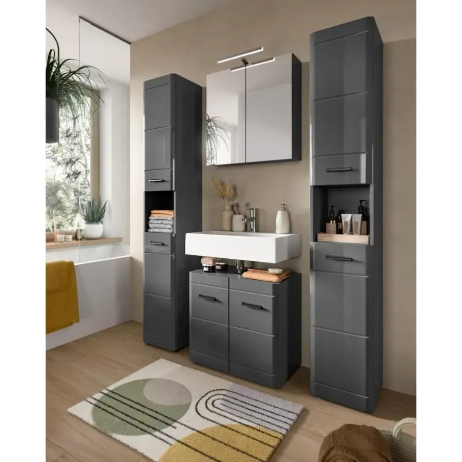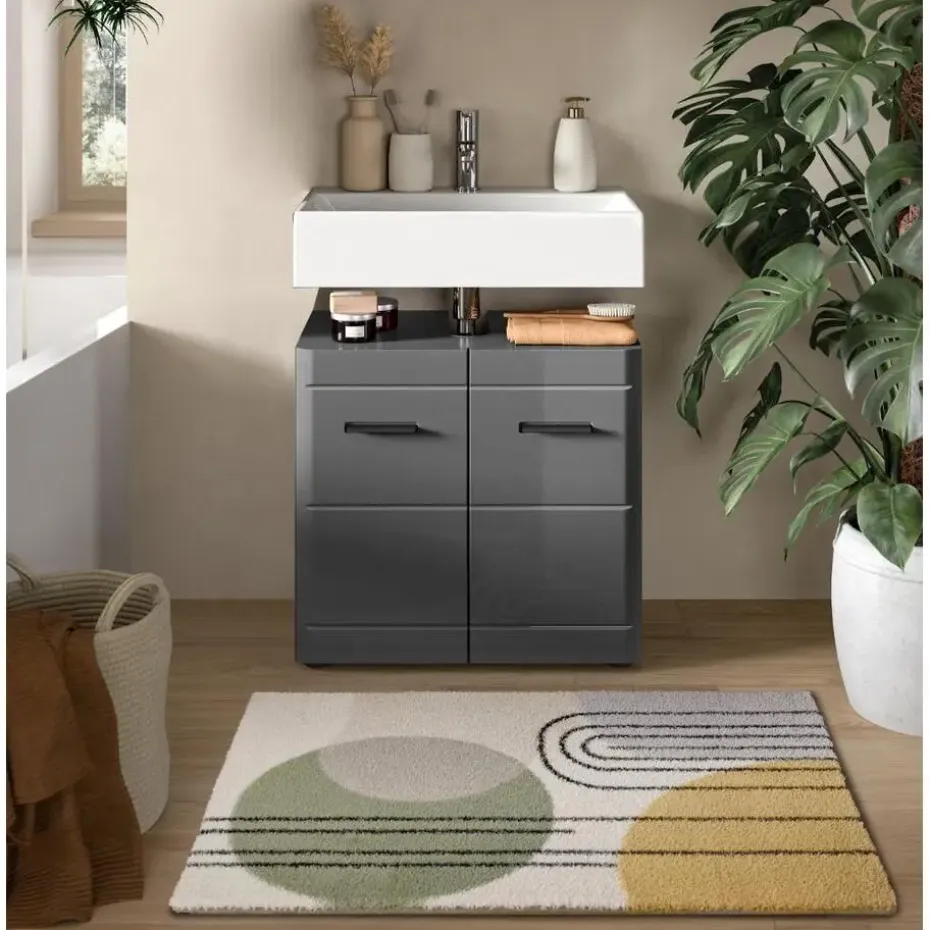 Soft wastafel 2 deuren grijs hoogglans, grijs. Zonder wastafel. Deur met Softclose. Onze wastafelmeubel in grijs imitatie en grijs hoogglans diepgetrokken afwerking, met afmetingen van 60x56x34 cm, combineert stijl en functionaliteit voor uw badkamer. Dankzij het slimme ontwerp en de royale opbergruimte wordt het een onmisbaar element in uw dagelijkse routine.