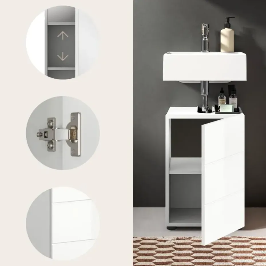 Vira wastafel 1 deur wit hoogglans, wit. Zonder wastafel. Deur omkeerbaar. Geef je badkamer een nieuwe look met ons stijlvolle witte melamine wastafelmeubel met een hoogglanzende, diepgetrokken afwerking. De compacte afmetingen passen perfect onder je wastafel en bieden tegelijkertijd voldoende opbergruimte voor al je badkamerbenodigdheden. Voeg een vleugje elegantie en functionele verfijning toe aan je badkamer met dit moderne meubel.