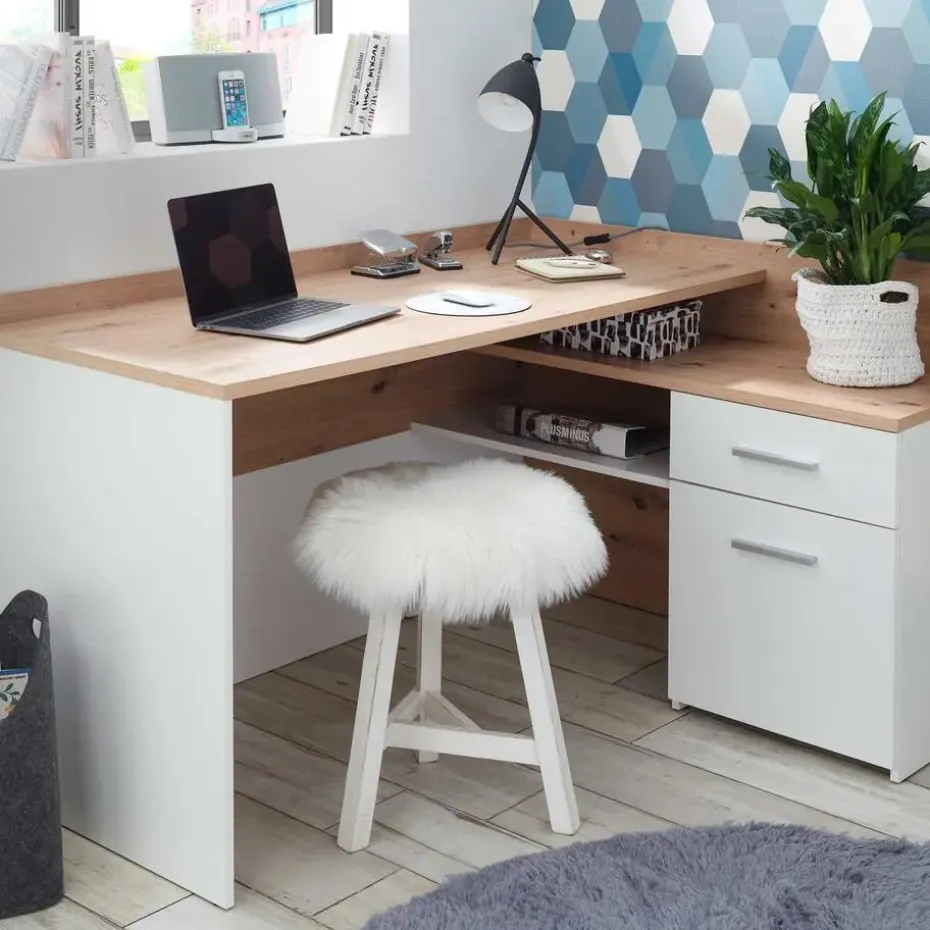 Dit hoekbureau Morkov is een prijsvriendelijk en compact bureau dat past in elk thuiskantoor. Het meubel is gefabriceerd in witte spaanplaat, het werkblad en andere accenten in artisan eikdecor. Het hoekbureau is uitgerust met een lade en een kast, elk voorzien van een metalen handgreep, en legplanken van verschillende groottes. Op die manier kan je al je documenten en spullen eenvoudig opbergen. Bovendien is er meer dan voldoende plaats om je laptop eenvoudig te kunnen gebruiken. De ideale oplossing voor elke thuiswerker of student!