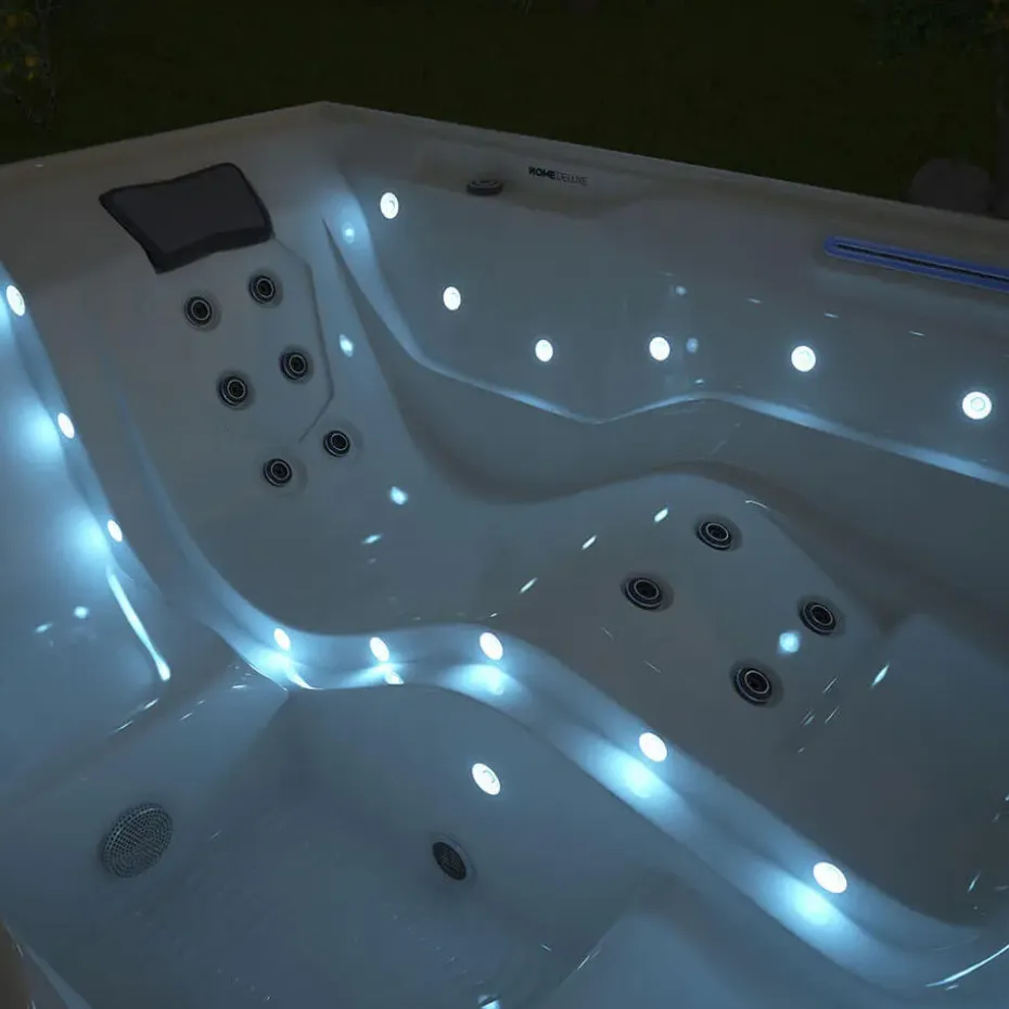 De STREAM PURE is bijzonder betoverend in de avonduren met de vier buitenste LED-lichtstrips aan elke rand. Het zachte licht verlicht de ruimte rond de hottub, terwijl de LED-verlichting in de vloer en op de binnenmuren een gezellige sfeer creëren.