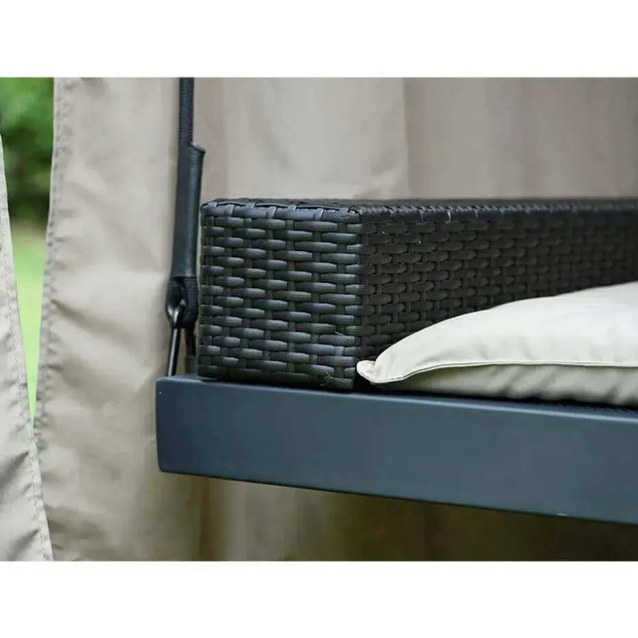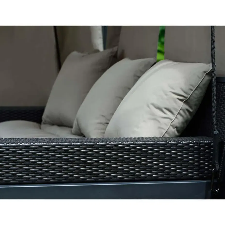 Het model heeft een robuust frame van gepoedercoat staal. In totaal dienen vier stevige ijzeren staven als houders voor de heerlijk brede en diepe bank. Arm- en rugleuning zijn gemaakt van robuust polyrotan. Zonwering of ligstoel: een licht vouwdak dat open of dicht kan, biedt u beide mogelijkheden. Hoogtepunten zijn de zachte kussens en de heerlijk mooie gordijnen, die ook bij het tuinpaviljoen worden meegeleverd.