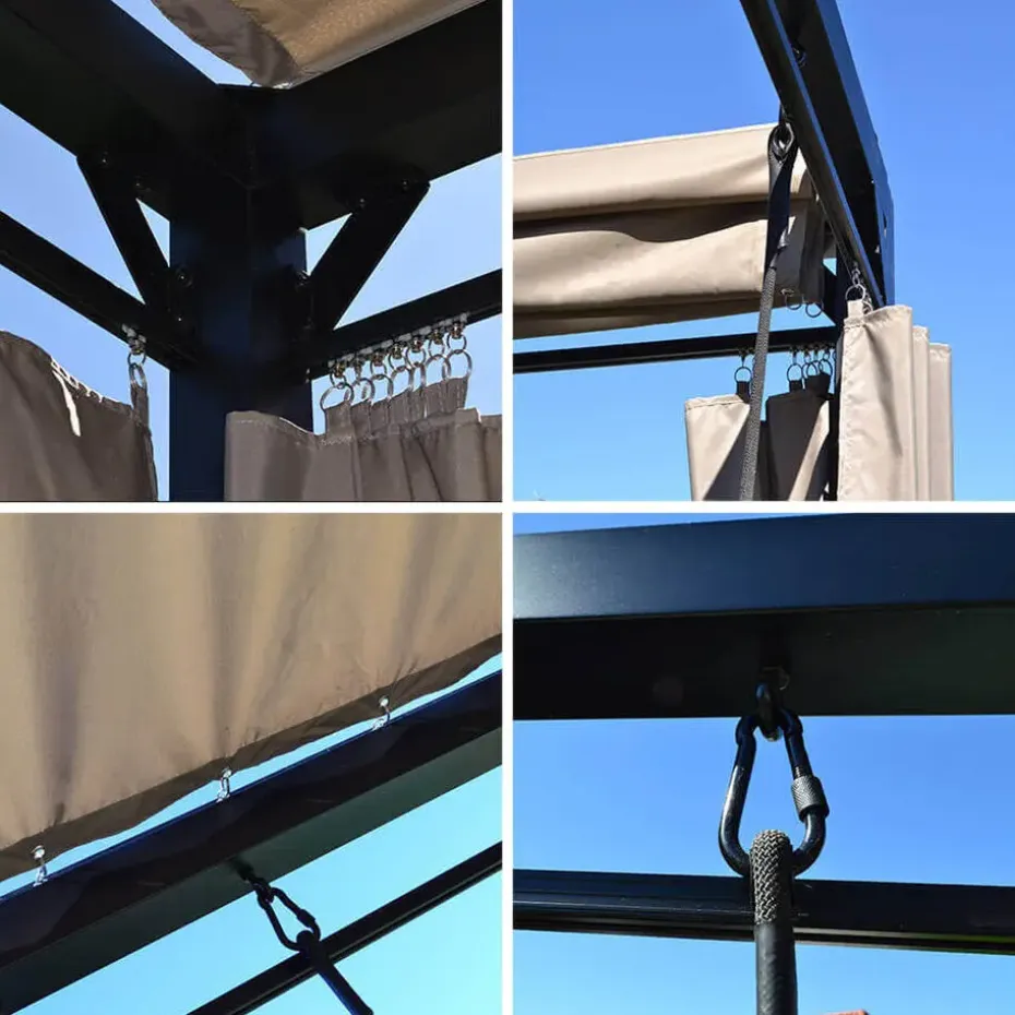 Het tuinpaviljoen biedt bovendien een heerlijke zon- en windbescherming. De strak geweven gordijnen van 100% polyester houden fel zonlicht en iets sterkere wind buiten. Tegelijkertijd is het materiaal van de gordijnen waterafstotend, zodat u, ook als er een lichte zomerregen valt, niet naar binnen hoeft te rennen terwijl u ontspant in uw tuinpaviljoen.
