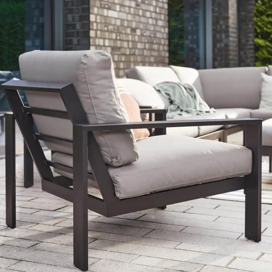 Comfortabel in de tuin – de RIO zithoek RIO biedt je een stijlvolle manier om de dag af te sluiten. In plaats van na een lange dag in de benauwde woonkamer te zitten, kun je buiten op deze comfortabele zithoek genieten van de laatste zonnestralen. Hij is gemaakt van hoogwaardig aluminium en combineert tijdloze schoonheid met functionaliteit. De brede rug- en armleuningen en de waterafstotende kussens zorgen voor maximaal comfort. Dankzij het weerbestendige, vuilafstotende en UV-bestendige materiaal is de set ideaal voor in de tuin, patio, serre of tuinhuisje. De lichtgewicht aluminium constructie maakt hem makkelijk verplaatsbaar en garandeert duurzaamheid zonder te roesten. Perfect om te ontspannen met familie en vrienden.
