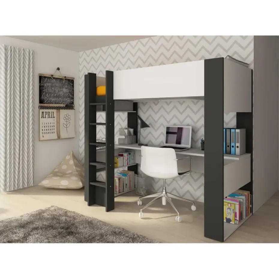 Deze hoogslaper met bureau is gemaakt van spaanplaat en werd afgewerkt in hoogwaardig melamine. De grafietgrijze accenten geven het geheel een contrastieve toets. Dit bed is ook beschikbaar in andere kleurencombinaties. Ontdek ze snel allemaal op onze site!