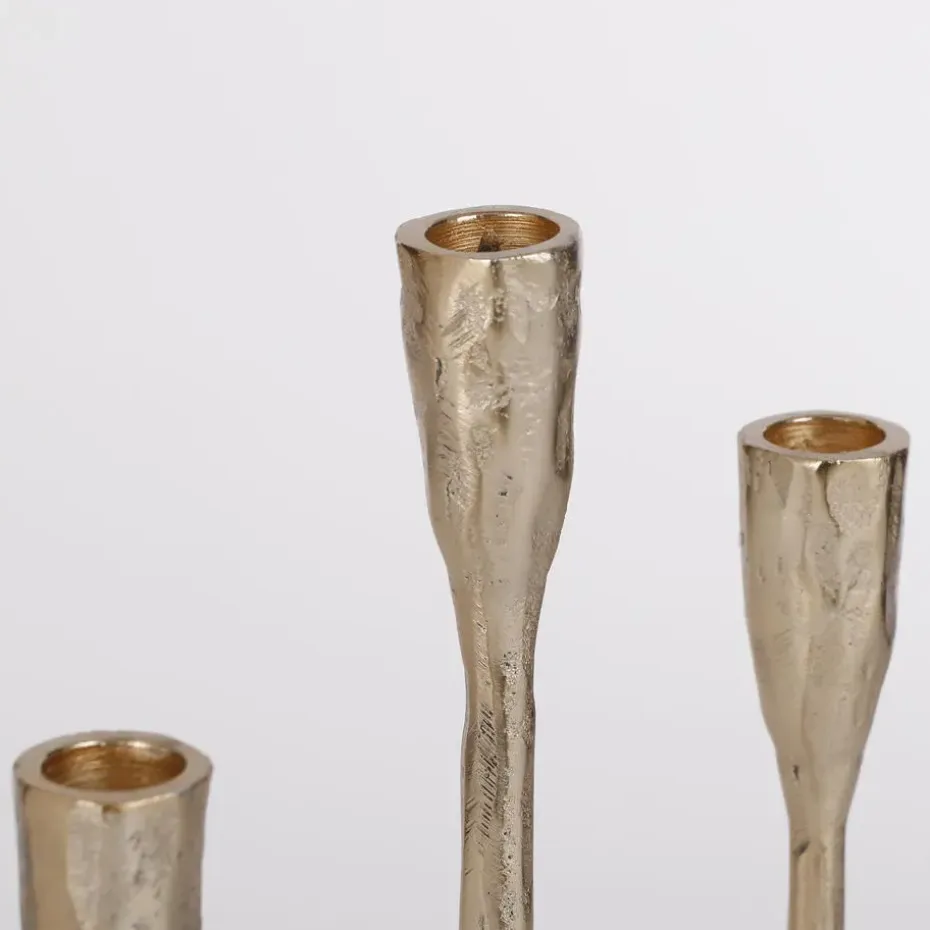 De Stretto kandelaar van House of Seasons heeft een klassiek design in een feestelijke, gouden kleur. De vrij ruwe afwerking geeft hier een authentieke draai aan, waarin de Indiase roots goed zichtbaar zijn. Erg mooi voor op tafel, bijvoorbeeld tijdens het kerstdiner. Je kan drie dinerkaarsen in de kaarsenhouder kwijt. De kandelaar is gemaakt van aluminium en heeft een afmeting van L21 x B9,5 x H40,5.