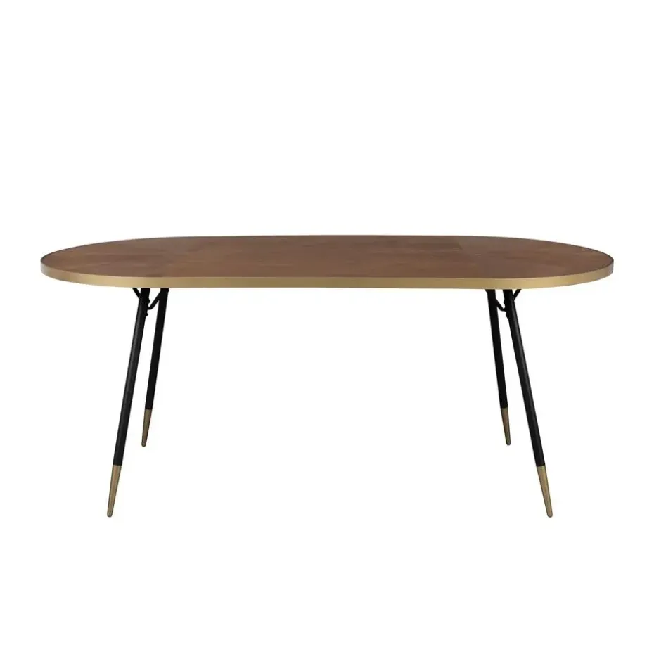 Alle Denise tafels maken onmiddellijk indruk. Deze serie tafels, die varieert van bijzettafel, salontafel tot consoletafel, is er nu ook als eettafel. Er is een ronde eettafel Denise en een ovale eettafel Denise. Allebei vallen ze op door het prachtige stervormige patroon in het tafelblad. Het fineer blad is gebeitst en gelakt in een warme notenhout kleur. Dan hebben we het nog niet eens gehad over die bijzondere messingkleurige afwerking van de poten en het tafelblad. Welke Denise tafelvariant(en) kies jij?