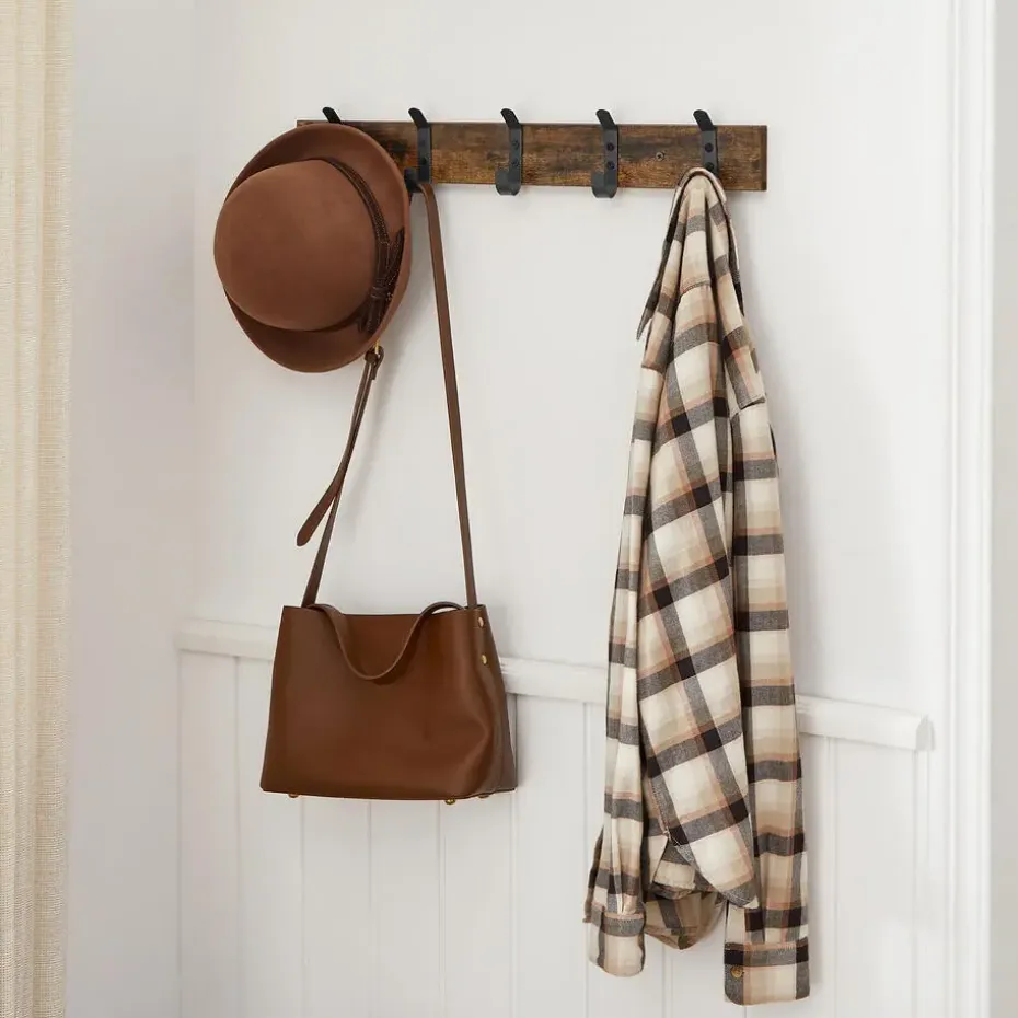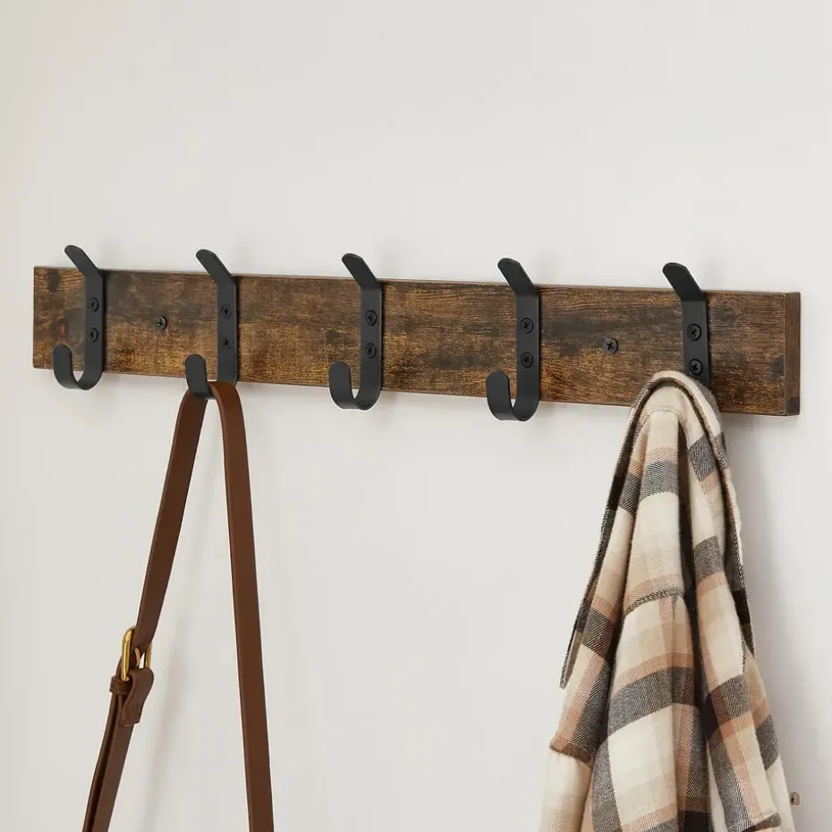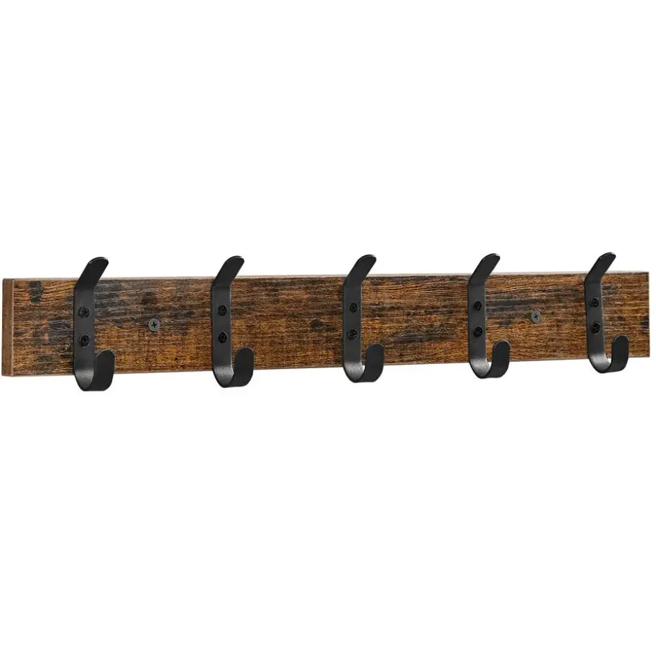 Dankzij de rustiek bruine plank en de mat zwarte haken heeft deze lange kapstok een leuke vintage design.