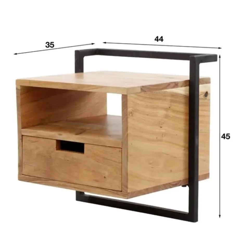 Dit nachtkastje ‘air solid’ is uitgevoerd in metaal met acaciahout. Deze combinatie geeft dit nachtkastje een eigentijdse uitstraling en deze is dan ook heel goed te combineren met de meeste bedden. Dit nachtkastje wordt door middel van een strip met drie schroefgaten aan de muur gemonteerd, waardoor het nachtkastje hierop kan hangen. Zie hiervoor de foto. Dit nachtkastje behoort tot de ‘air solid’ serie.