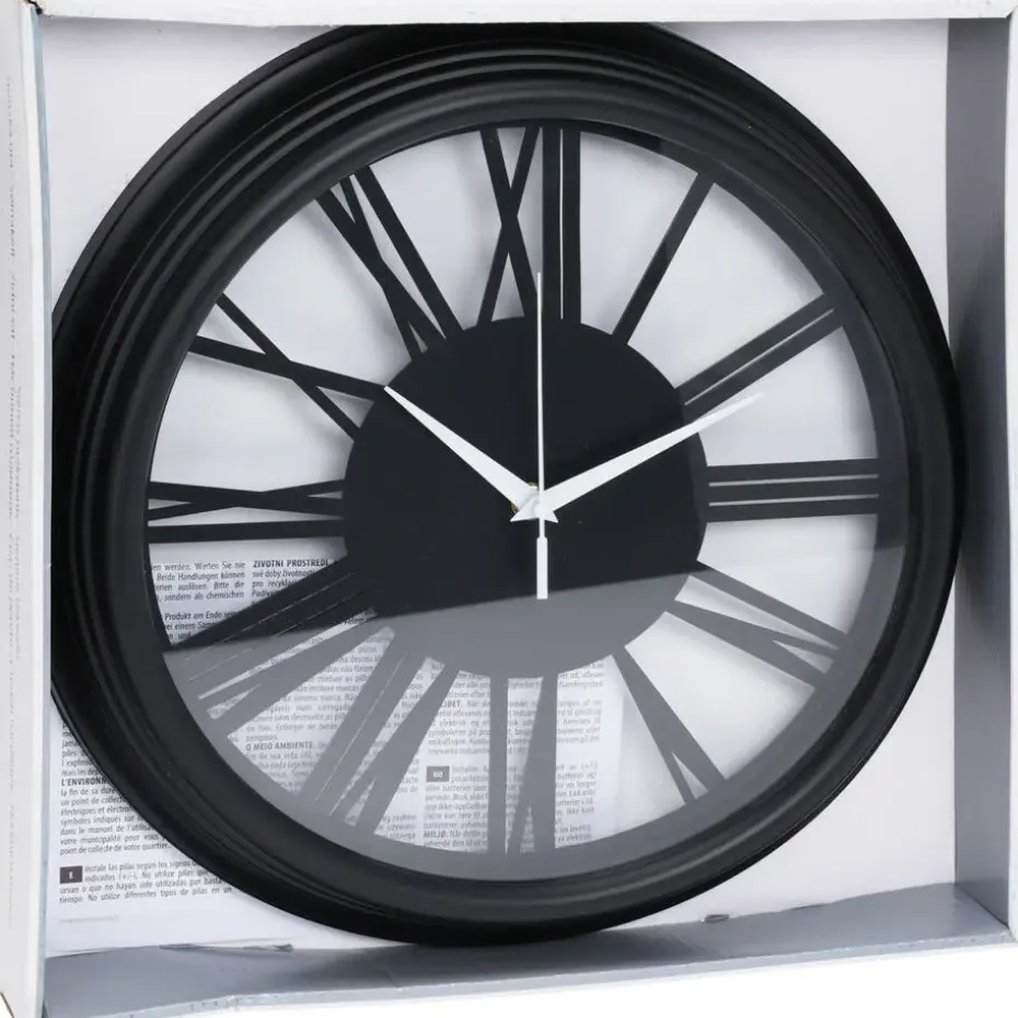 Wandklok Memphis voor aan de muur/wand in de huis/studeerkamer met een diameter van 37 cm en dikte 7 cm. Grote klok met Romeinse cijfers. Kleuren: zwart/transparant glas. Aan de achterkant zit een ophanging(bevestigingsmateriaal niet inbegrepen). Materiaal: kunststof/kunststof/glas. Voeding: 1x AA-batterij, niet inbegrepen. Gewicht: 1.6 kilo. Deze klok straal een fijne rustige sfeer uit, met een mix tussen stijlvol en praktisch.