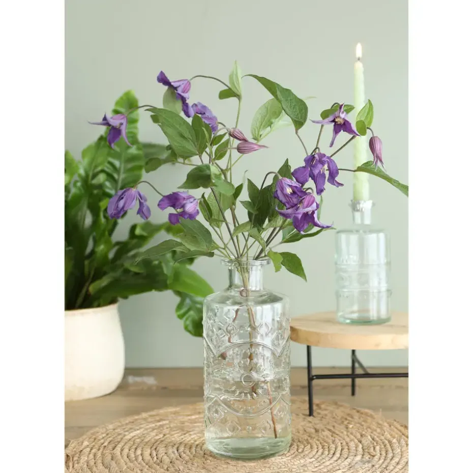 Bloemenvaas/siervaas fles model Berlin in helder transparant glas, met sierlijk motief. Formaat 9 x 21 cm. Deze prachtig gedetailleerde vaas is uitstekend te gebruiken voor losse bloemen, takken en als decoratief object voor binnen gebruik. Ook leuk te gebruiken om een kaars in te zetten, of als olielampje met een lont erin. De mond van de fles is ca. 4 cm breed.